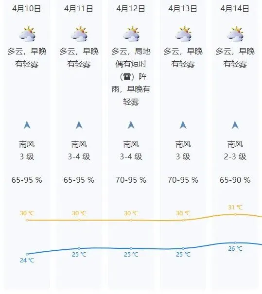 深圳今日多云,早晚有轻雾,气温24-30℃;11-15日多云为主,间中局地有短时(雷)阵雨,早晚有轻雾,白天体感较热。需注意防范早晚能见度下降的影响。
