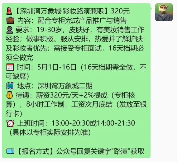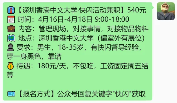 >【深圳兼职】250元/小学社会实践活动、320元/彩妆路演、520元/香港中文大学快闪、210元/4S店访客、180元/布场搬运......