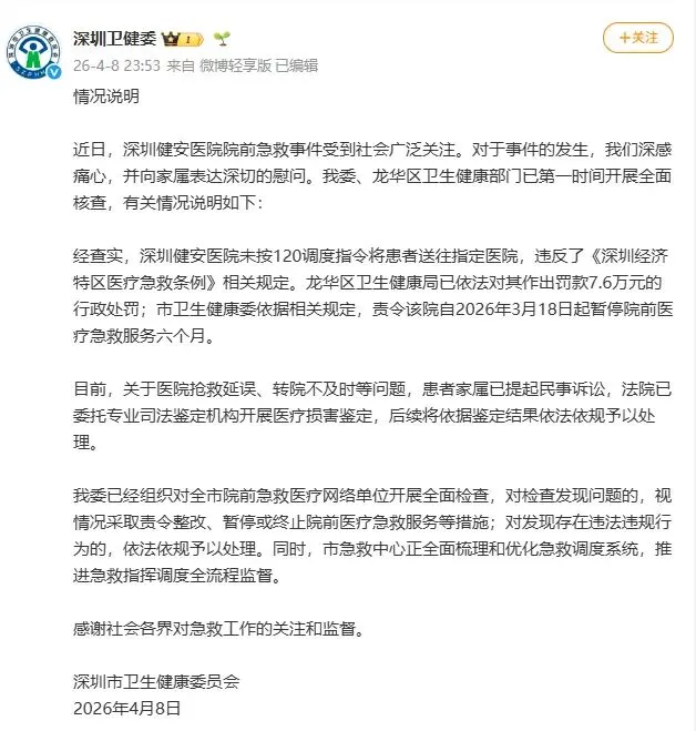 4月8日深夜,深圳市卫生健康委员会就深圳健安医院院前急救事件发布官方情况说明,对事件经过、调查进展及后续处置措施作出公开回应。具体如下: