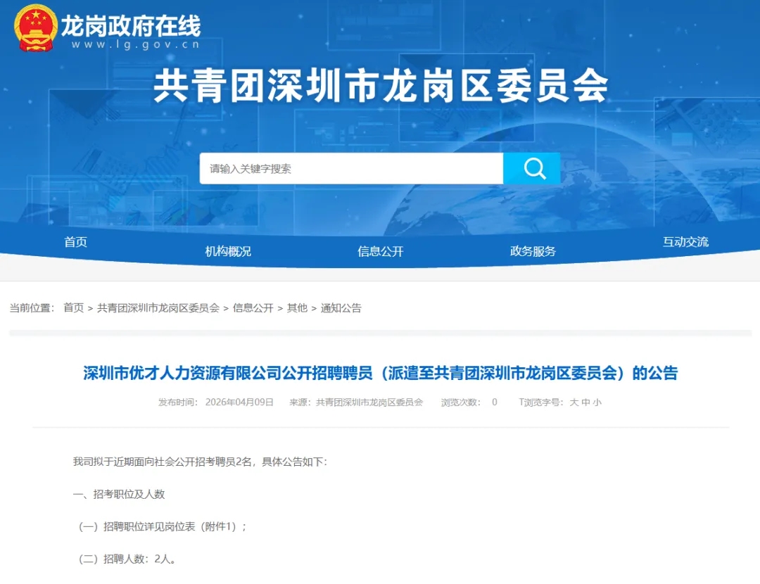 本次招考采取公开考试的方式进行招聘,相关信息公告在龙岗政府在线、深圳市优才人力资源有限公司网站发布。