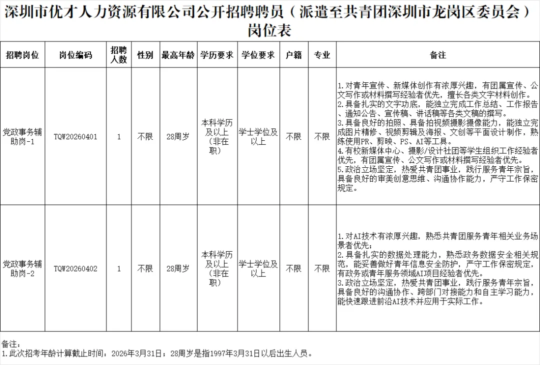 附件1:深圳市优才人力资源有限公司公开招聘聘员(派遣至共青团深圳市龙岗区委员会)岗位表