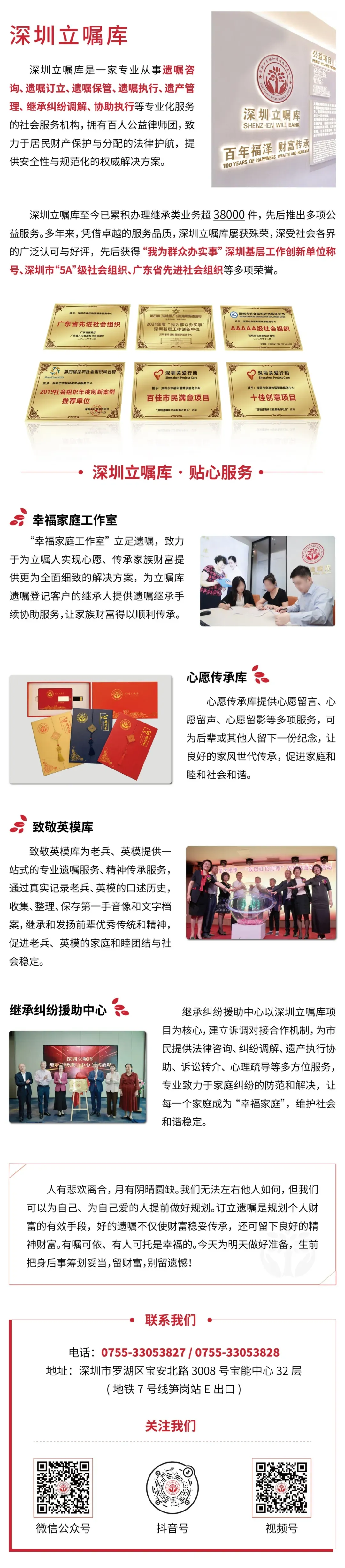 从“保管箱”到“人生规划伙伴”的角色转变,深圳立嘱库走了十年, 最终搭建起一套覆盖咨询、起草、订立、保管、更新、执行、调解的服务体系,让遗嘱真正从“立得下”走向“行得通”,让每一份遗嘱,都能从纸面走向现实,让每一份爱,都能顺利抵达。