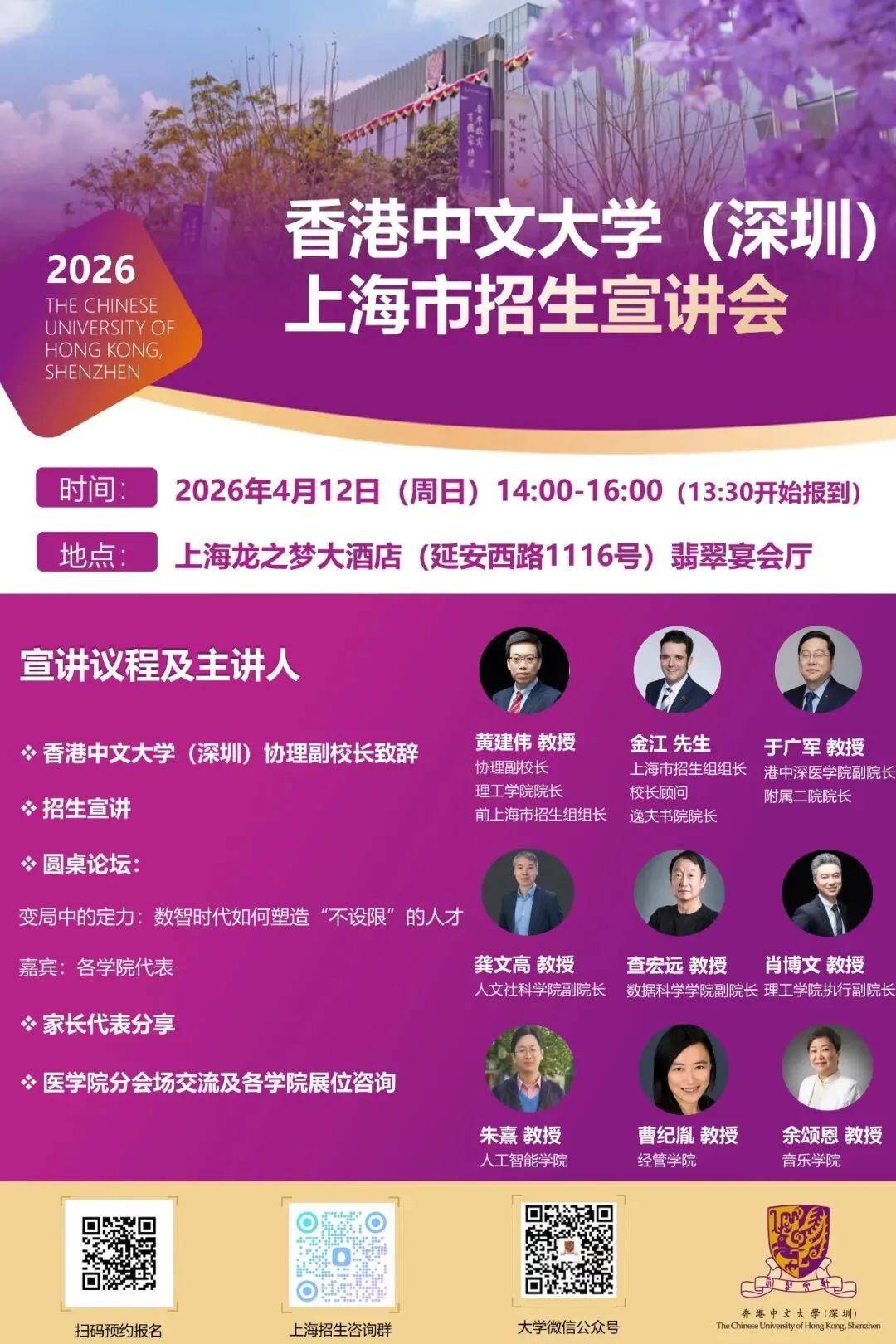 2026年,香港中文大学(深圳)在上海的招生模式为高考裸分录取和校测631并行的两种录取方式。为让更多的考生和家长更好地了解大学基本情况并分享最新的招生信息和政策,我校上海招生组将于4月12日在上海市开展招生宣讲会活动,欢迎感兴趣的家长、学生参加!