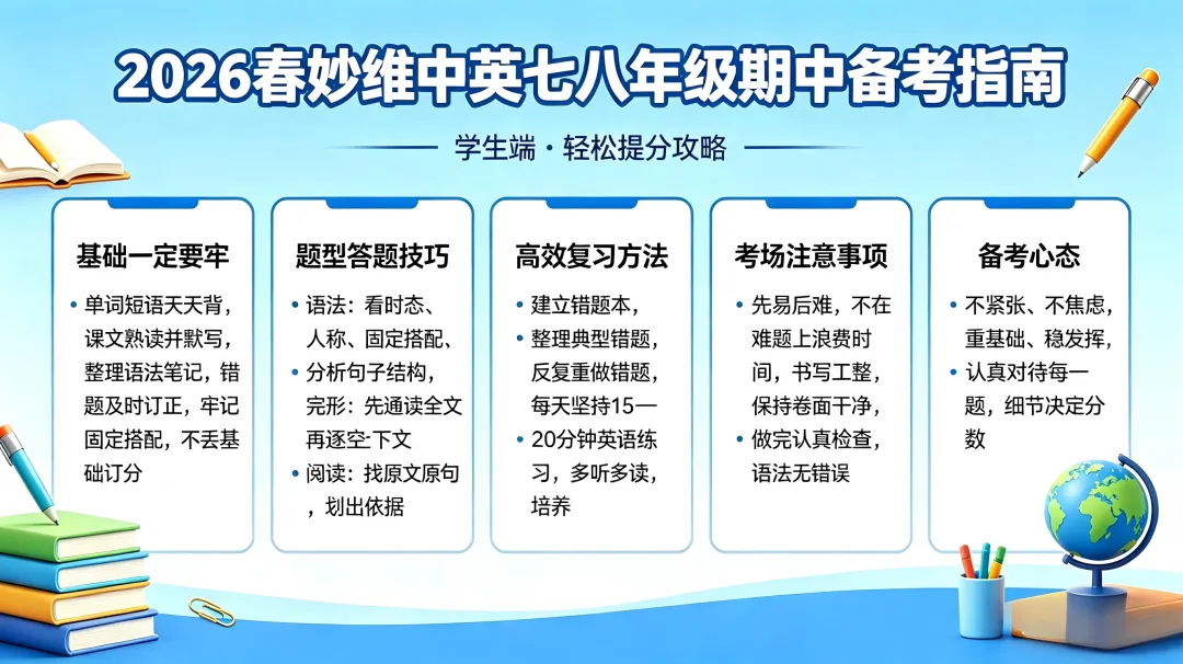 下面给大家整理了各科期中复习重点思路,家长可以转给孩子对照复习:初中英语