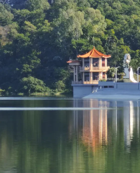 顺着台阶慢慢走,没几分钟就能走到山顶。山顶有个劳乐亭,是董必武先生亲笔题的字,站在这个亭子里,视野特别开阔。近处能看到深圳水库波光粼粼的水面,远处能望见梧桐山的青山绿树,一边是古色古香的中式亭台,一边是深圳的城市高楼,两种风景搭配在一起,看着格外舒服。
