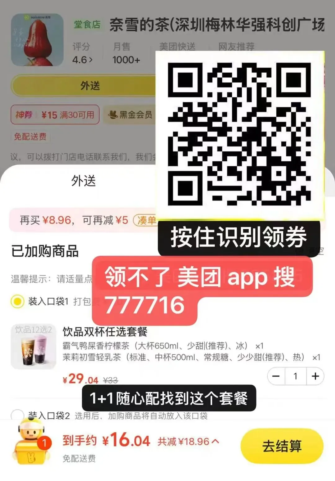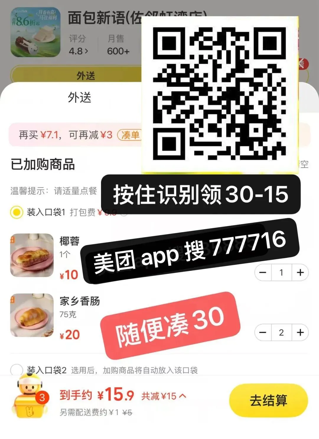 使用方法:美团APP搜“777716”或者直接扫👇下面👇二维码即可领券。
