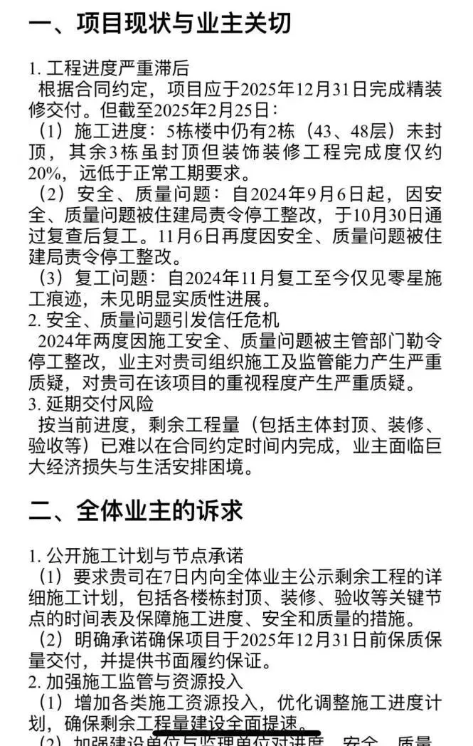 2024年9月至11月,项目被业主发现疑似停工。在距离交付仅剩约10个月时,业主现场摸排发现施工人人数少、材料较少,且最重要的精装修未大规模开始,引发对能否按时保质交付的深切担忧。