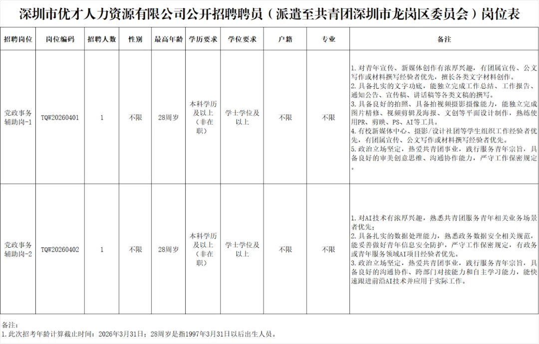 公示结束无异议并报区组织、人力资源部门同意备案后,由深圳市优才人力资源有限公司与录取人员签订劳动合同,此次招聘的员工列入深圳市优才人力资源有限公司派遣管理,具体岗位由用工单位共青团深圳市龙岗区委员会安排。聘用人员必须在规定时间内报到。逾期不能报到的,或在职人员在规定的时间内与原单位协商不成,无法办理手续的,聘用资格不予保留。