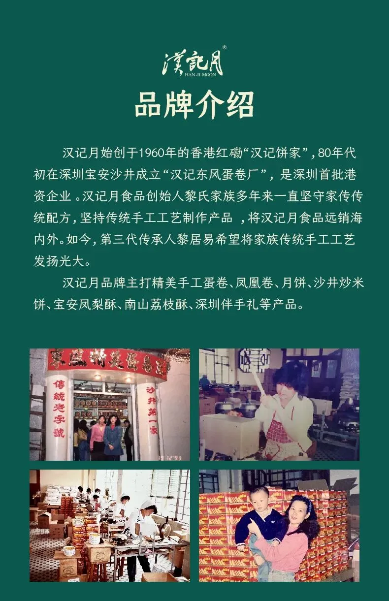 深圳市汉记精美食品有限公司源于1962年香港红磡芜湖街的“漢記”,主打家传手工蛋卷。创始人黎式家族将中式传统手艺结合西式点心做法创造出别具一格的精美蛋卷王。1983年初,黎式家族决定随中国改革开放的东风将家传手工蛋卷带回内地并改良工艺及设备,在深圳宝安沙井成立 “汉记东风蛋卷厂”,这亦是 “汉记食品” 的前身。汉记多年来一直坚守家传独特配方,坚持传统手工工艺,也凭着招牌的非遗制作技艺将产品远销海内外。如今第三代非遗传承人黎居易希望继承传统使家传手艺广泛传播。