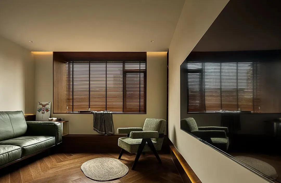 本案为鼎太风华87平的两居室,业主为一对钟情于复古美学与收藏的年轻夫妻。设计以“小宅时光,精致叙事”为核心理念,旨在将复古韵味与宜居尺度相平衡。通过局部深色调、经典材质与精选单品,在有限空间内营造一个充满故事感与个人印记、同时确保明亮通透的复古精神角落。装修背景与业主需求:业主热爱中古家具、黑胶与艺术画册,希望家是独特而温馨的收藏馆。核心诉求是在小户型中实现浓郁的复古氛围,同时保证空间不显压抑,并拥有充足的系统收纳来兼顾展示与储物。房子情况与设计思路:色彩控制与视觉延伸:采用局部深色焦点墙(如墨绿、深蓝) 搭配大面积浅色墙面,人字拼木地板通铺,在营造复古基调的同时保持空间明亮感。开放式格局与材质点缀:打通客厅与阳台,扩大视野与采光。运用黄铜五金、丝绒面料、 vintage 玻璃及做旧金属等元素,于细节处丰富质感层次。系统性收纳与陈列:定制嵌入式通顶储物系统,结合深色玻璃柜门与开放格,将珍贵藏品作为视觉焦点陈列,日常杂物则隐藏收纳,实现小空间的功能与美学统一。