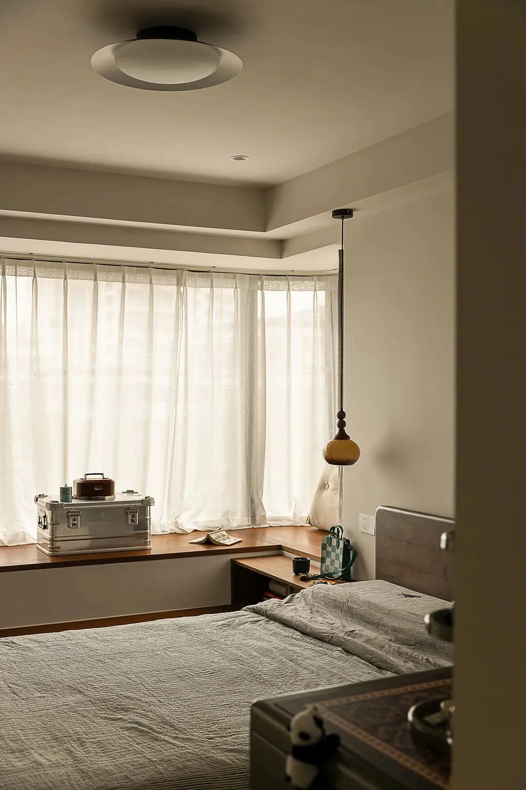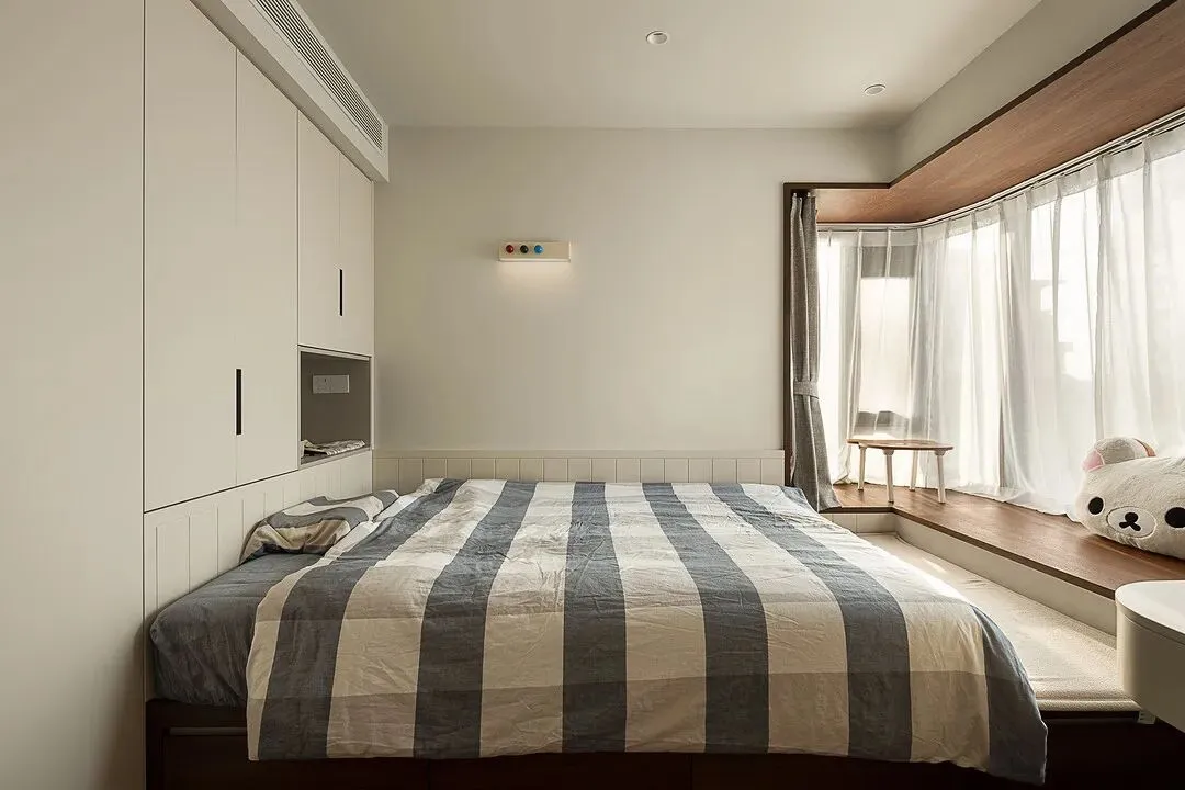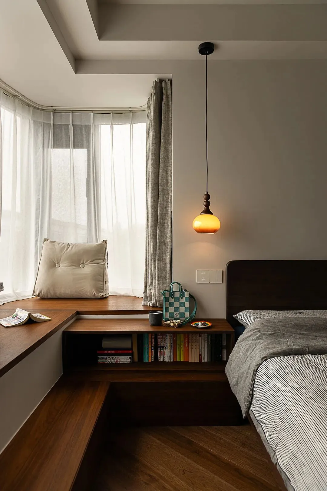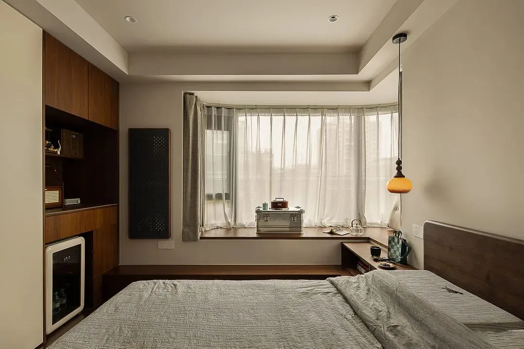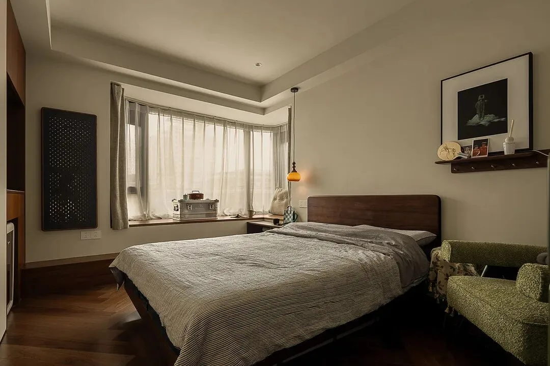 这是一间融合了现代简约、复古细节与收纳巧思的温馨卧室。浅灰色条纹床品与深色木地板奠定沉静基调,墨绿扶手椅与装饰画成为色彩点缀。飘窗改造为带开放式书架的阅读角,复古行李箱与书籍增添生活气息。嵌入HCK冰箱的深木纹储物柜实现功能整合,暖黄吊灯与百叶窗营造柔和光影层次。简净基调隐童趣,窗台熊伴暖心房。