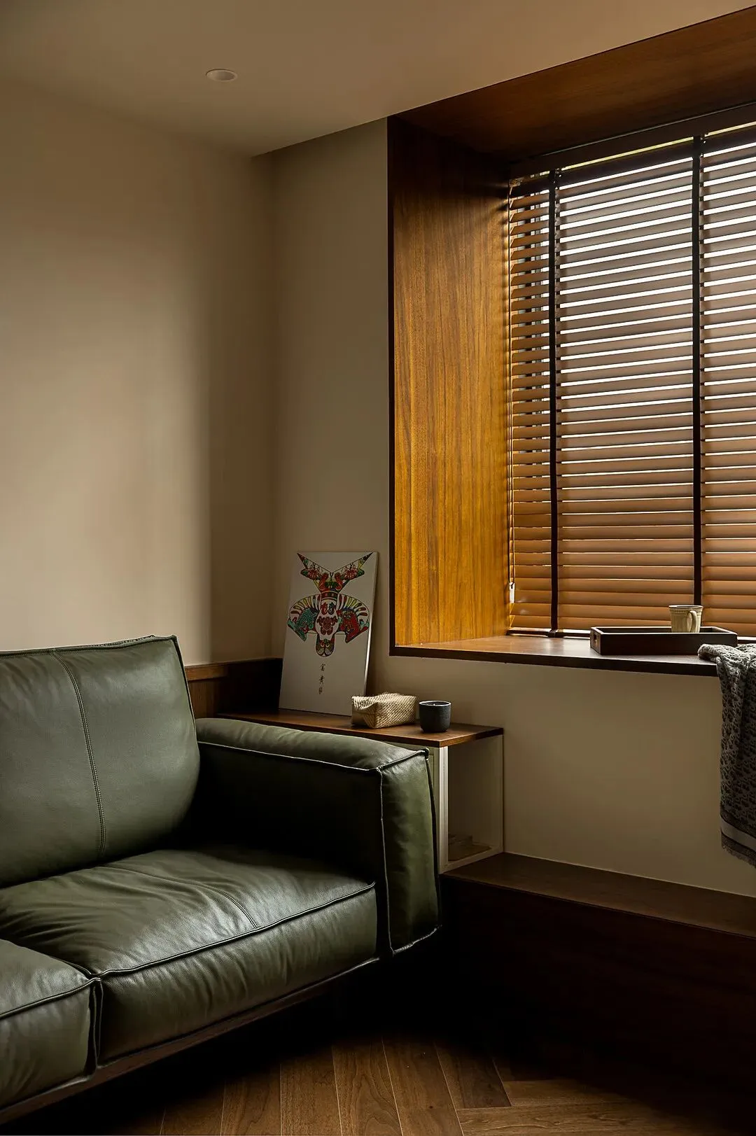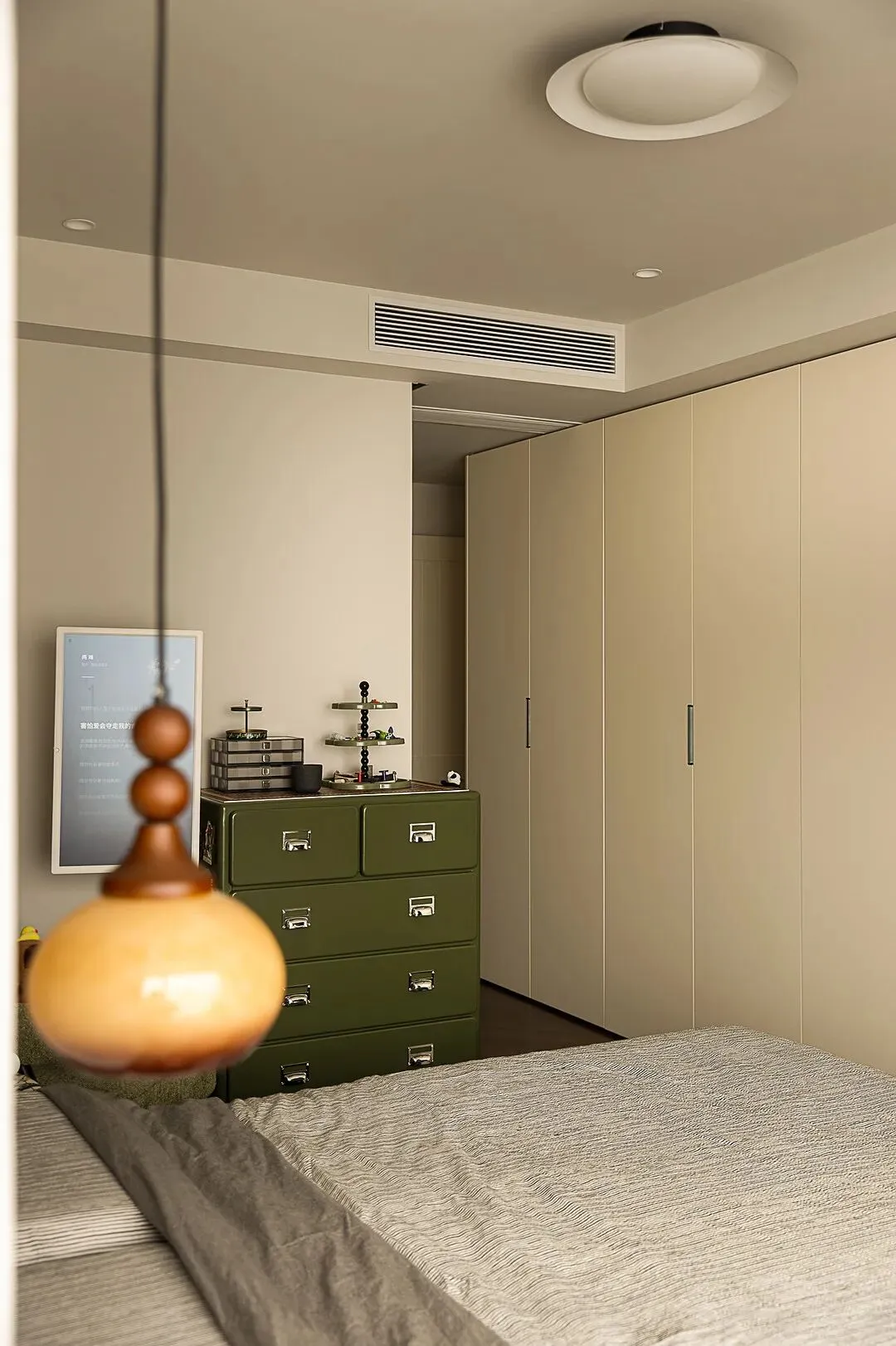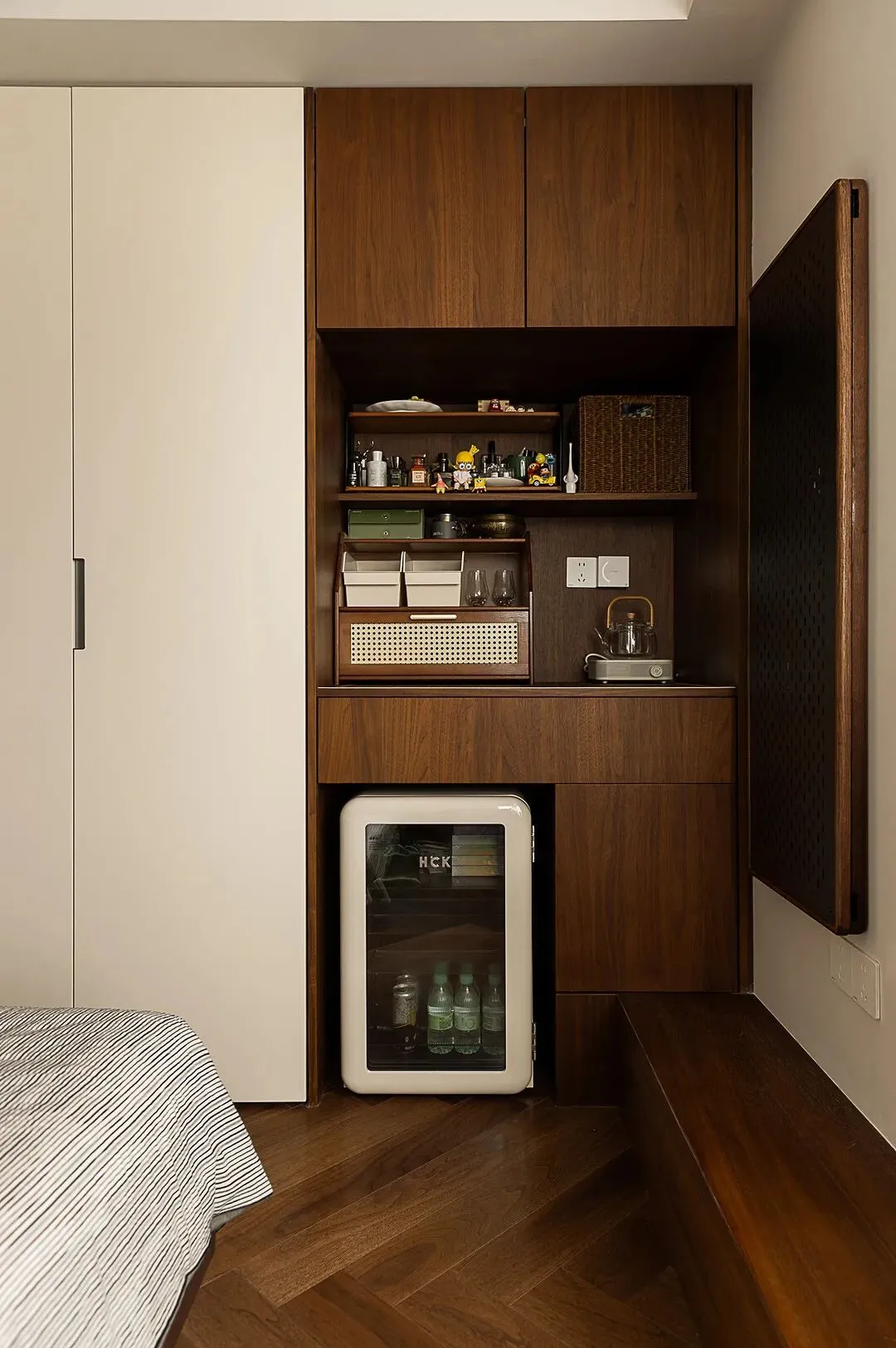 这是一间融合了现代简约、复古细节与收纳巧思的温馨卧室。浅灰色条纹床品与深色木地板奠定沉静基调,墨绿扶手椅与装饰画成为色彩点缀。飘窗改造为带开放式书架的阅读角,复古行李箱与书籍增添生活气息。嵌入HCK冰箱的深木纹储物柜实现功能整合,暖黄吊灯与百叶窗营造柔和光影层次。简净基调隐童趣,窗台熊伴暖心房。