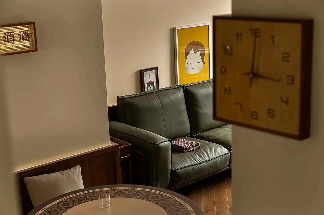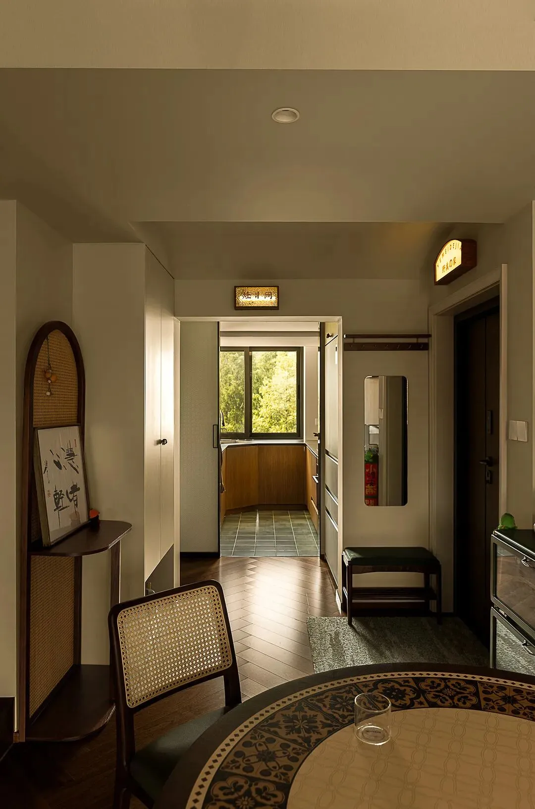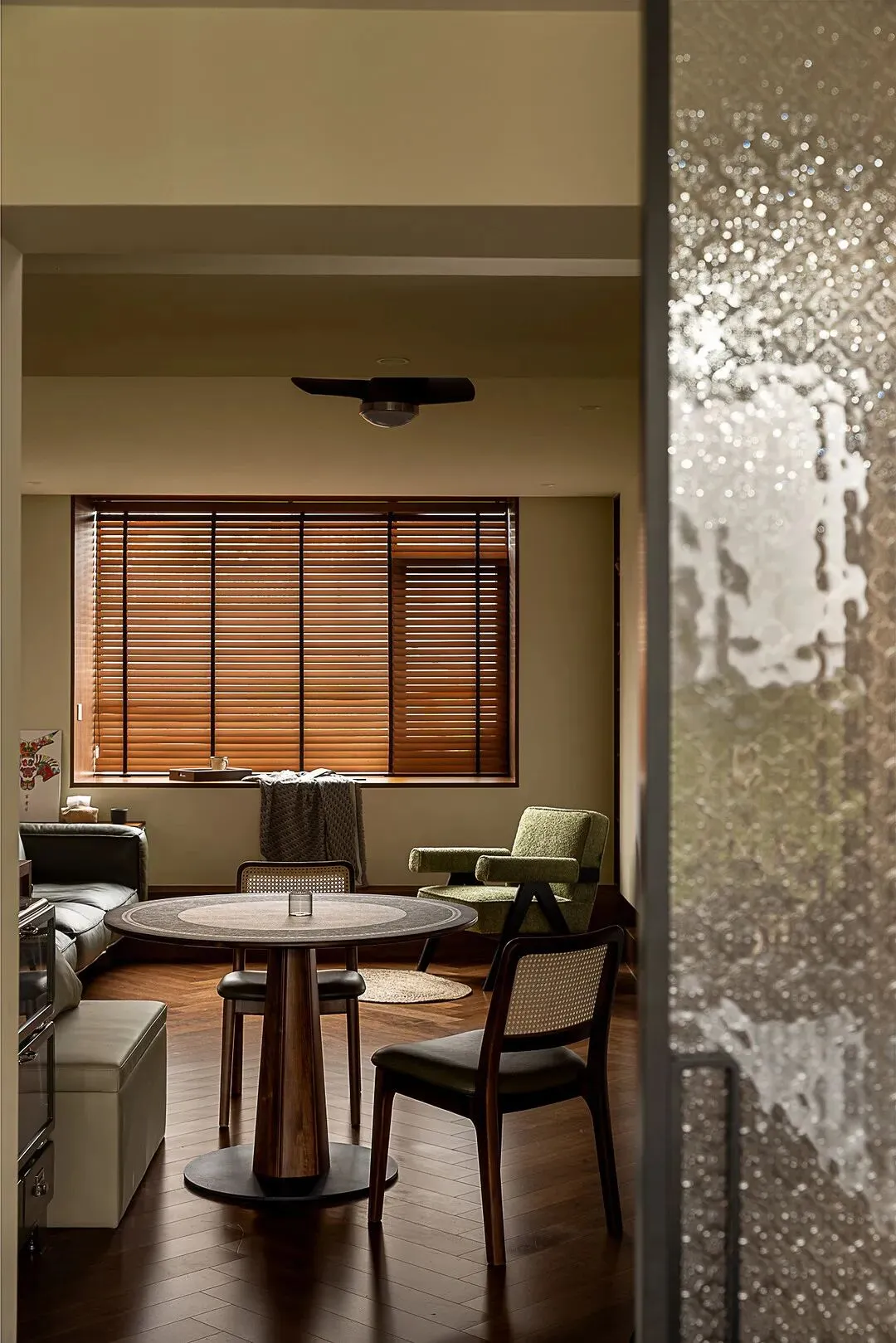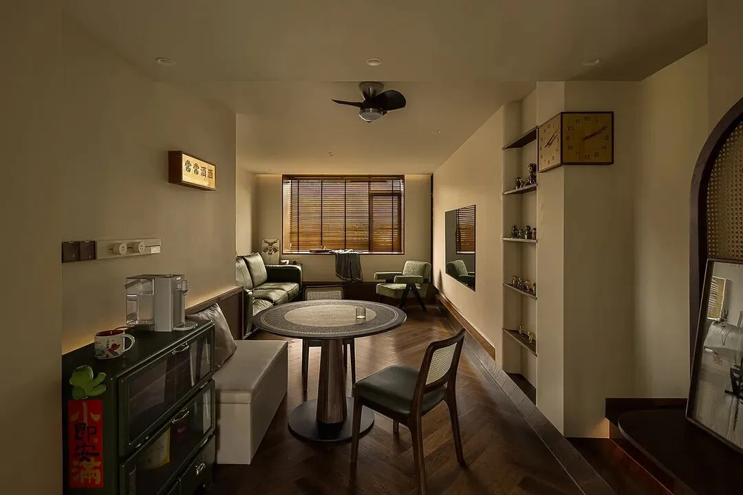 这是一间融合了复古、自然与生活气息的温暖餐厅。深色圆木桌搭配藤编靠背椅,桌面铺着印花桌布,摆放透明水杯。绿色冰箱与“常常酒酒”霓虹灯牌注入活力,弧形置物架陈列茶具与装饰画。纹理玻璃隔断划分空间却不阻光线,窗外绿意与百叶帘形成斑驳光影,整体营造出随性、惬意且充满故事感的用餐角落。简木映绿意,光影织静炊。