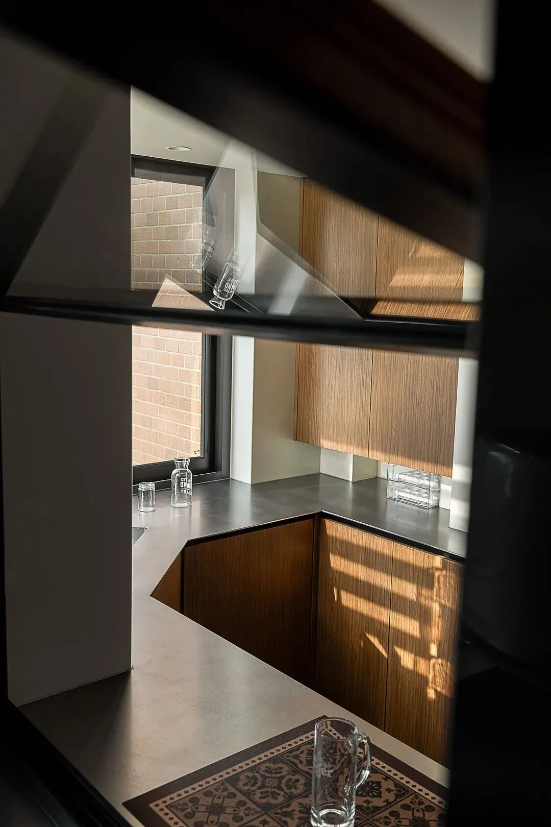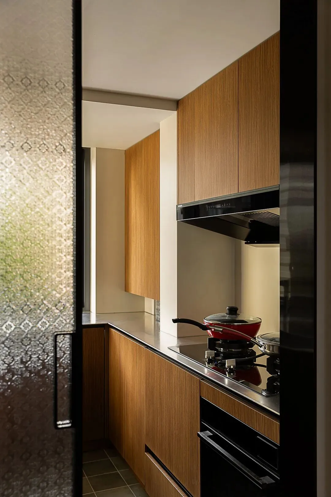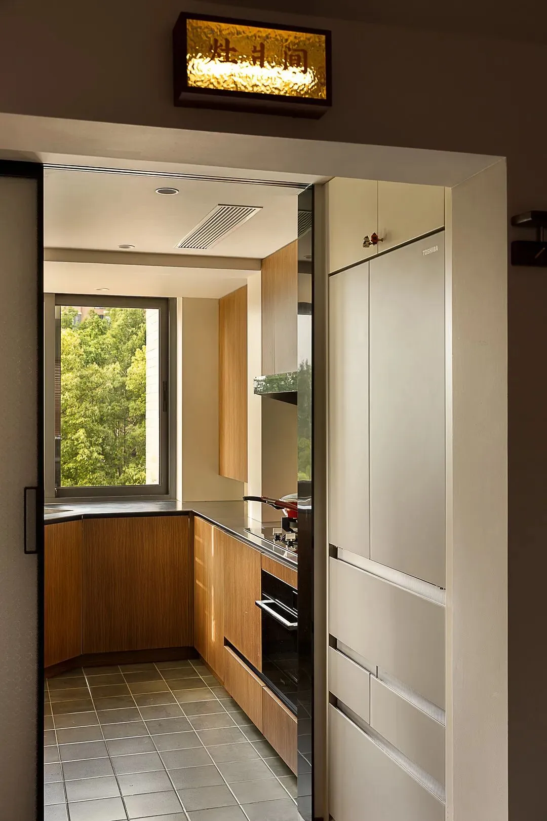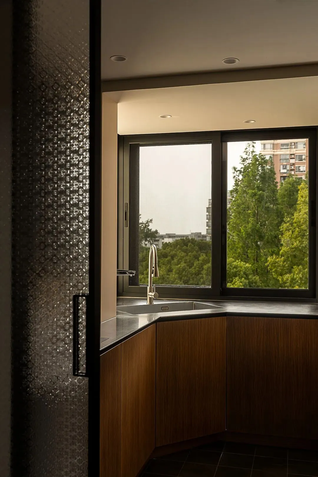 这是一间融合东方韵味与现代功能的传统厨房。入口金色“灶间”牌匾点明主题,浅木色橱柜与暖灰台面构建温馨基底。窗外绿意透过黑色花格玻璃门引入生机,红黑锅具与透明器皿点缀烟火气。大窗采光充足,窗外绿树高楼成为动态背景,营造出舒适、自然且富有生活气息的烹饪空间。木质飘窗映暖光,床品整洁盈安详。