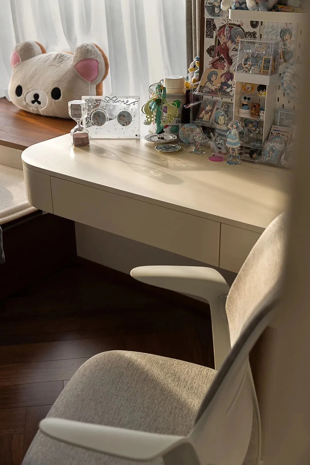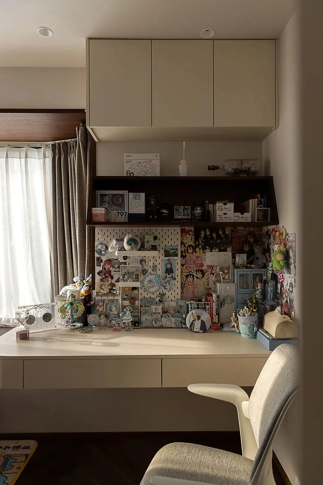 这是一间融合了简约、童趣与个性化收纳的现代儿童房。房间以白色、木色为基调,深色床铺搭配灰白格子床品。飘窗铺有坐垫,成为舒适的休闲角。书桌区域展示了丰富的动漫元素,墙上贴满海报,桌面和洞洞板陈列着手办与卡片,白色储物柜满足收纳需求。整体空间明亮、温馨且充满孩子的个性印记。
