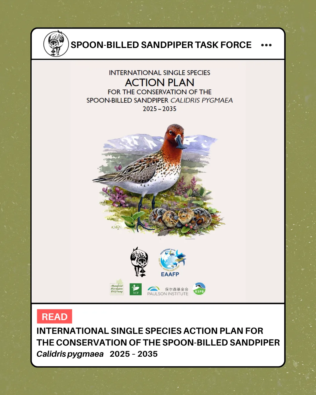 但残酷的现实是:勺嘴鹬目前全球存活数量可能不足300只。为了扭转这一物种的灭绝命运,2025年11月,在东亚- 澳大利西亚迁飞通道伙伴关系(EAAFP)第12次缔约方大会(MOP)上,一份承载着未来十年希望的蓝图——《2025-2035年勺嘴鹬保护行动计划》正式获得签署并采纳。