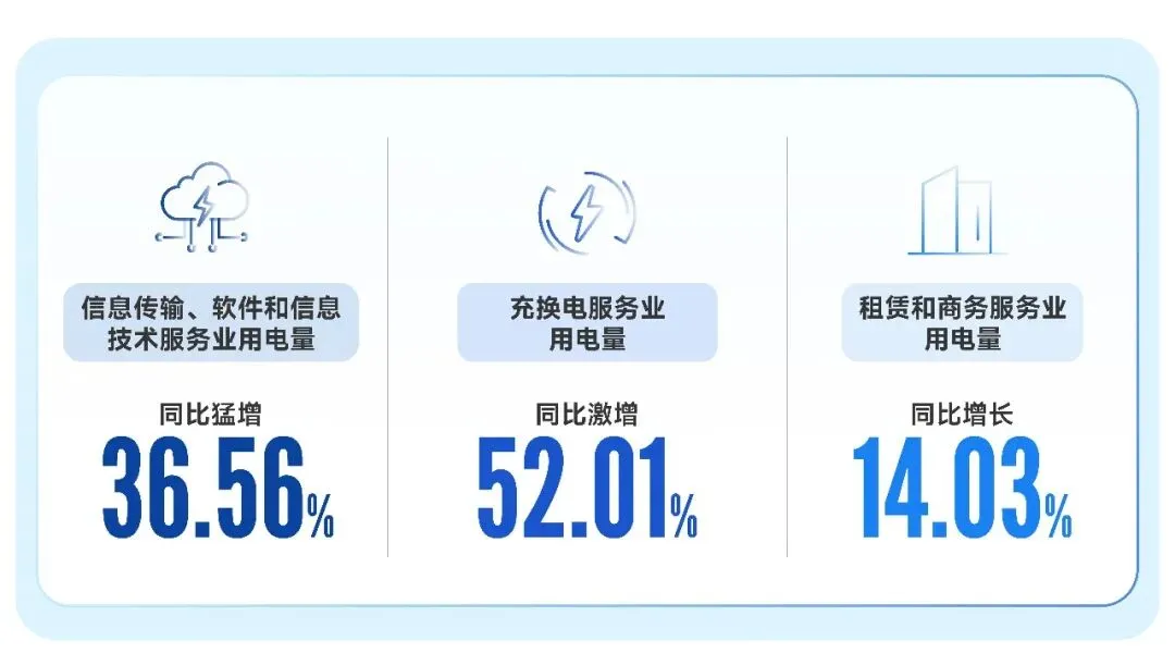 第三产业用电量同比增长10.20%,成为拉动全社会用电增长的另一重要因素,体现了新业态新服务“电力”十足。特别是数字经济核心产业表现尤为亮眼,信息传输、软件和信息技术服务业用电量同比猛增36.56%,彰显深圳数字产业化和产业数字化的蓬勃活力;与绿色出行息息相关的充换电服务业用电量同比激增52.01%,见证着新能源汽车普及与充电基础设施加速完善的“双向奔赴”。此外,租赁和商务服务业用电量同比增长14.03%,反映专业商务活动日趋活跃。