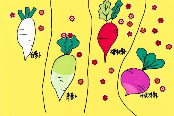 我去逛菜市场的时候发现好多不同颜色的萝卜,有白萝卜、红萝卜、青萝卜和胡萝卜!
