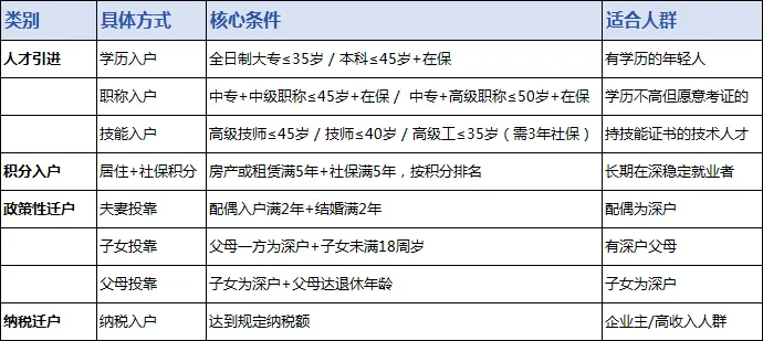 根据深圳现行政策,入户深圳主要有四大类方式:人才引进、积分入户、亲属投靠以及纳税迁户。其中,人才引进和积分入户是大多数人的选择。