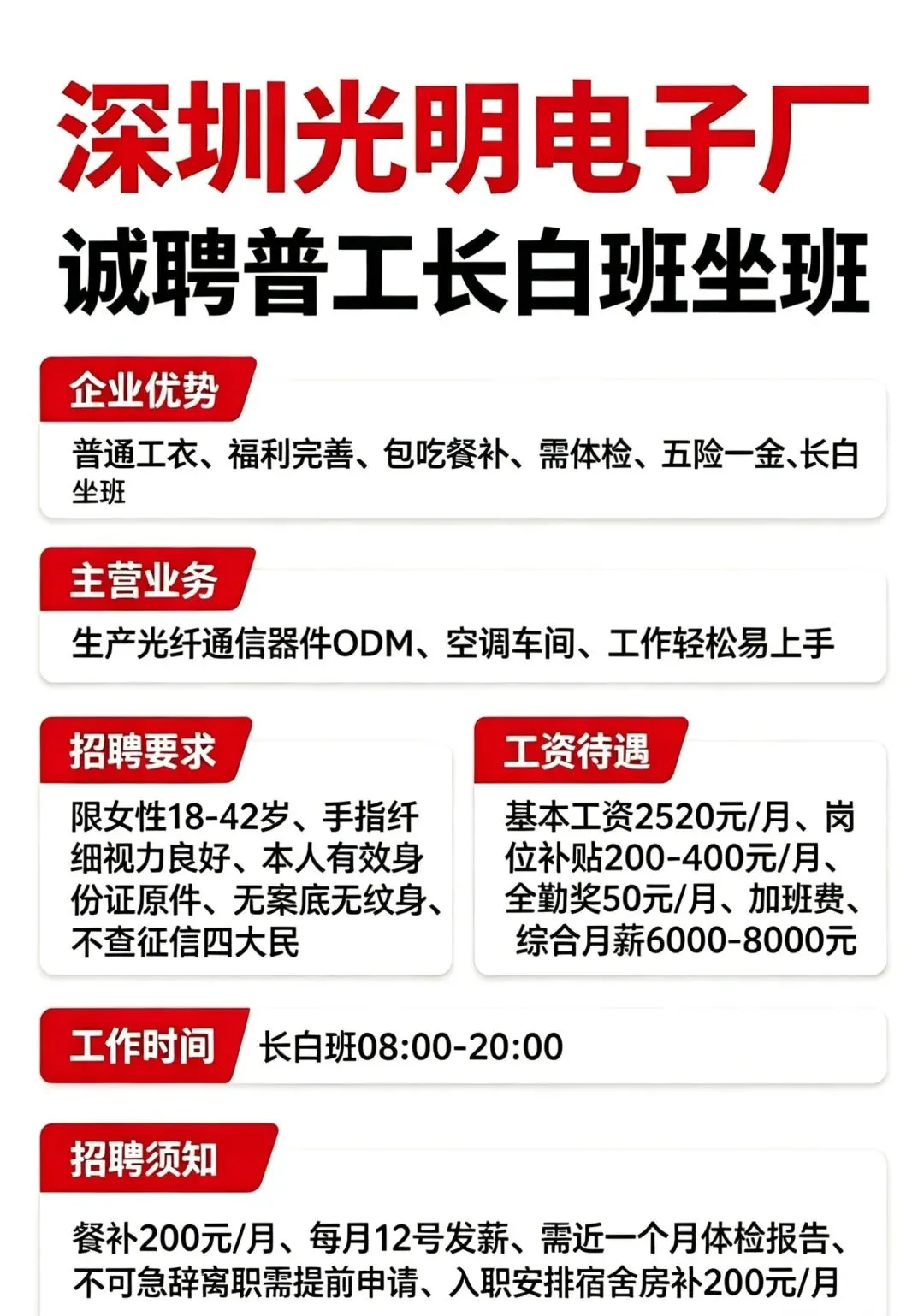 企业主要生产光纤通信器件ODM。普工岗位,普通工衣,空调车间,坐班,长白班,工作简单易上手!