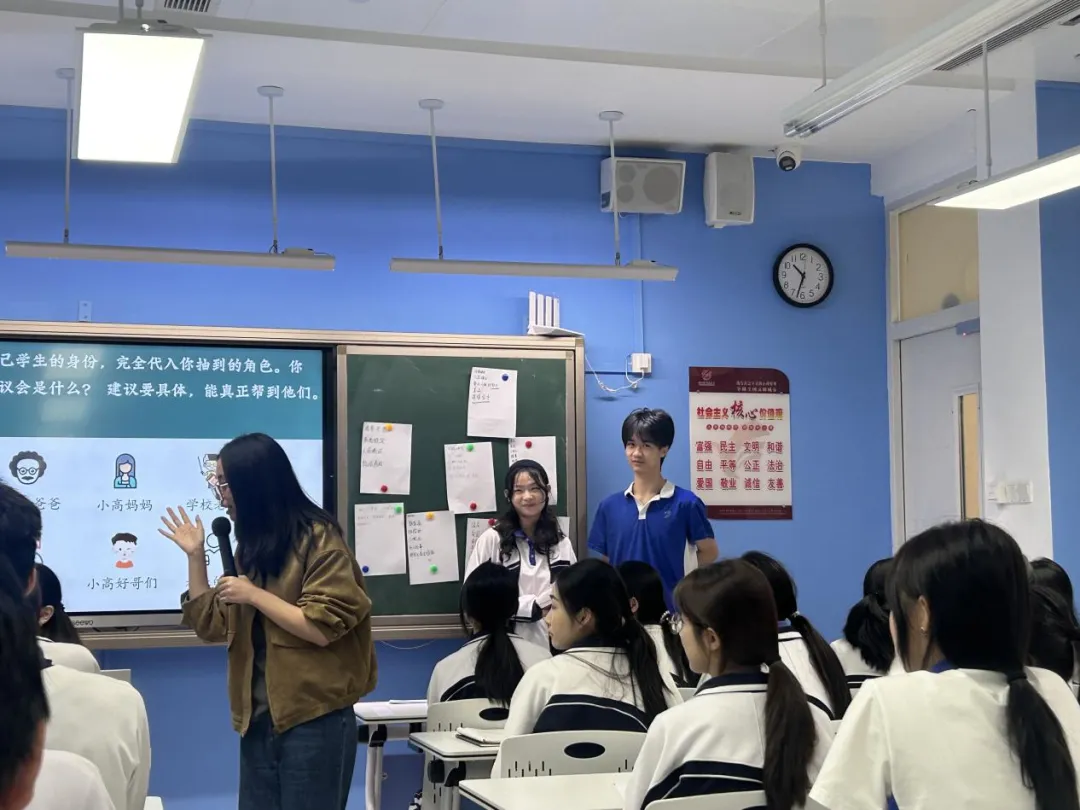 角色扮演环节,两位同学模拟高中生“初次约会”,其他同学化身:同学、家长、老师、未来的自己。