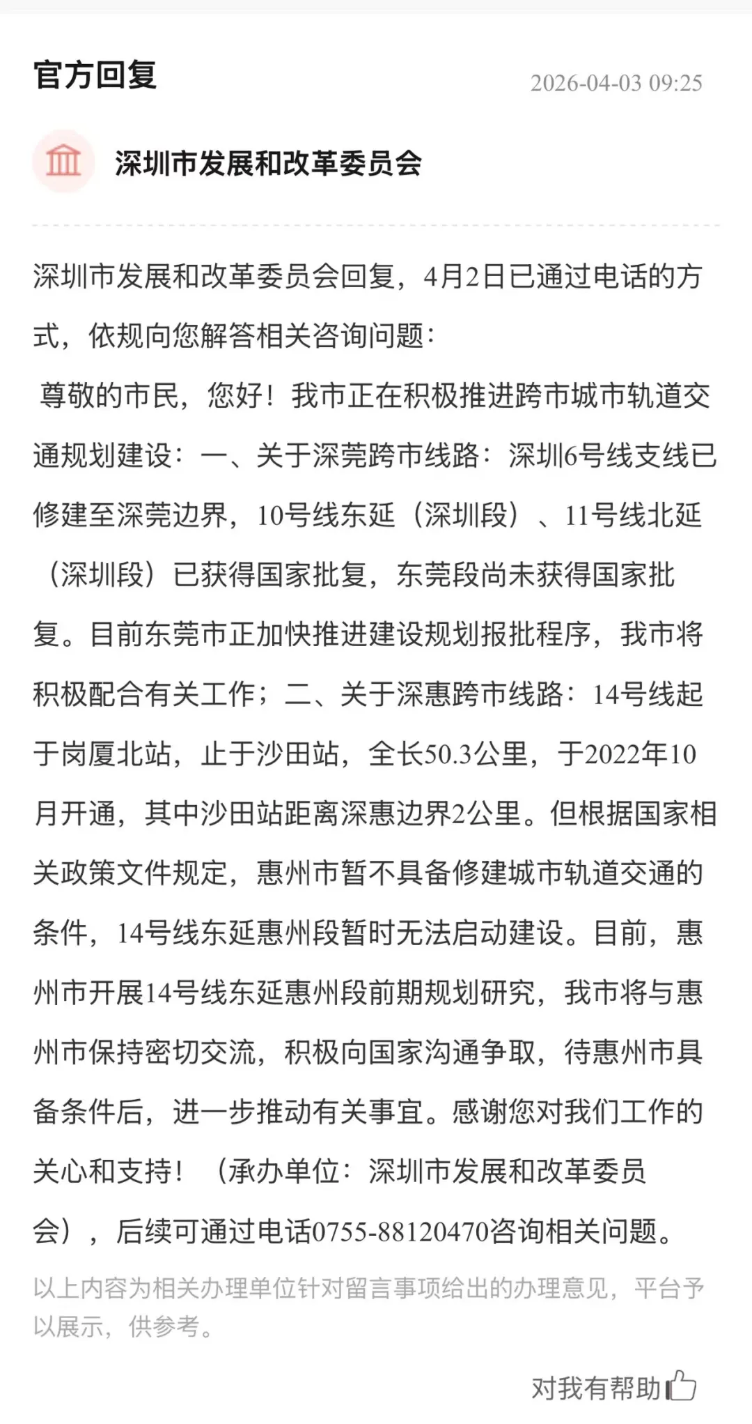2026年3月27日,有惠州网友在人民网领导留言板上提议,惠阳区交通运输局回复表示:地铁项目造价高、投资额巨大,规划建设需经科学严谨评估。目前,惠阳区正会同惠州市级部门与深圳市有关部门对接,能否将深圳地铁14号线东延惠州段纳入深圳市城市轨道交通第五期建设规划调整并上报审批,需上级部门予以研究支持。惠阳区将积极配合上级部门持续推进相关工作。