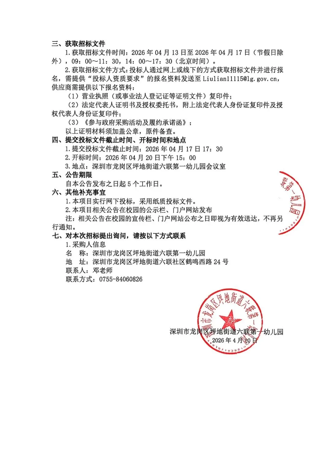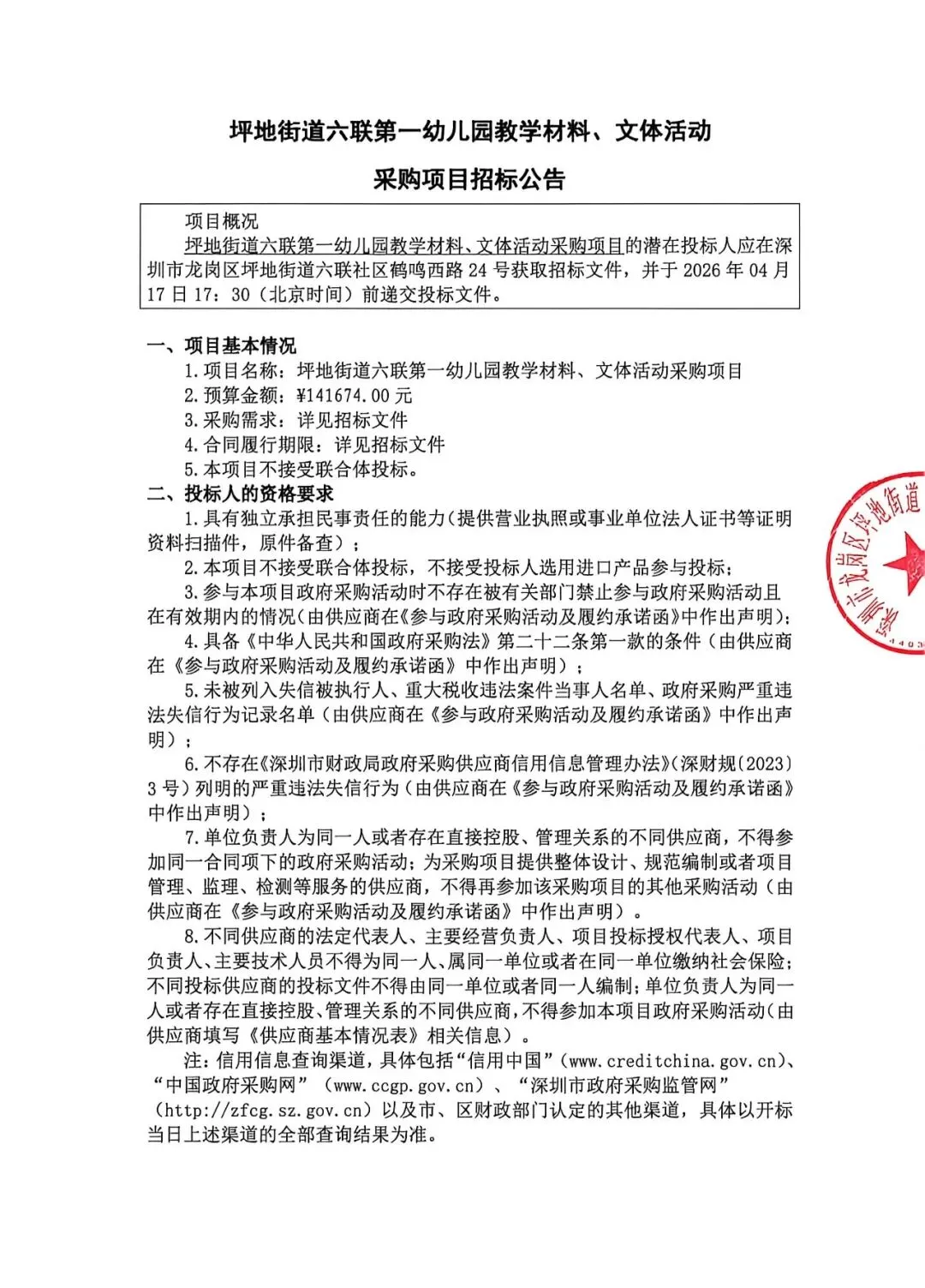 >深圳市龙岗区坪地街道六联第一幼儿园教学材料、文体活动采购项目招标公告