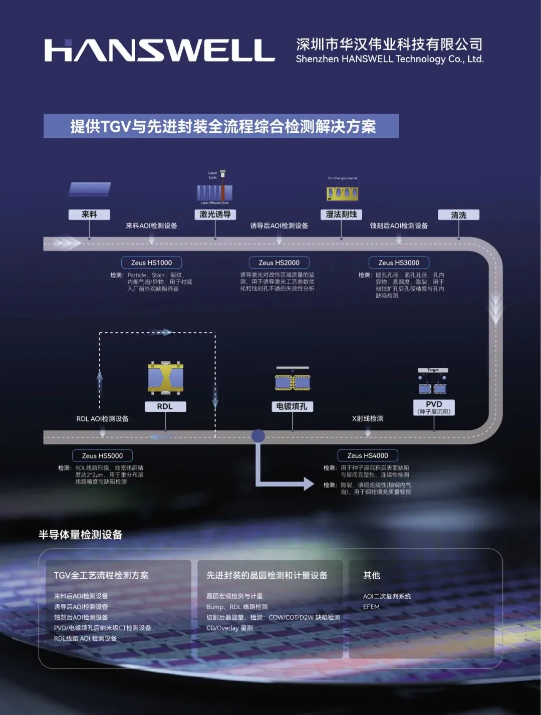 在半导体领域,华汉伟业深耕板级玻璃通孔(TGV)检测与晶圆宏观检两大核心赛道,依托自主研发的智能视觉平台,融合光学检测(AOI)、三维计量(3D)、X射线无损检测(X-ray) 等多模态技术,打造全流程检测与量测设备。产品覆盖TGV工艺全链条——从来料检测、激光诱导、湿法刻蚀、PVD、电镀填孔、研磨抛光、RDL重布线——实现制程工艺的检测闭环与数据互通。针对晶圆宏观检测,华汉伟业提供2D+3D+IR多模态融合检测平台,实现表面缺陷、三维形貌、内部隐裂的全维度质量监控。