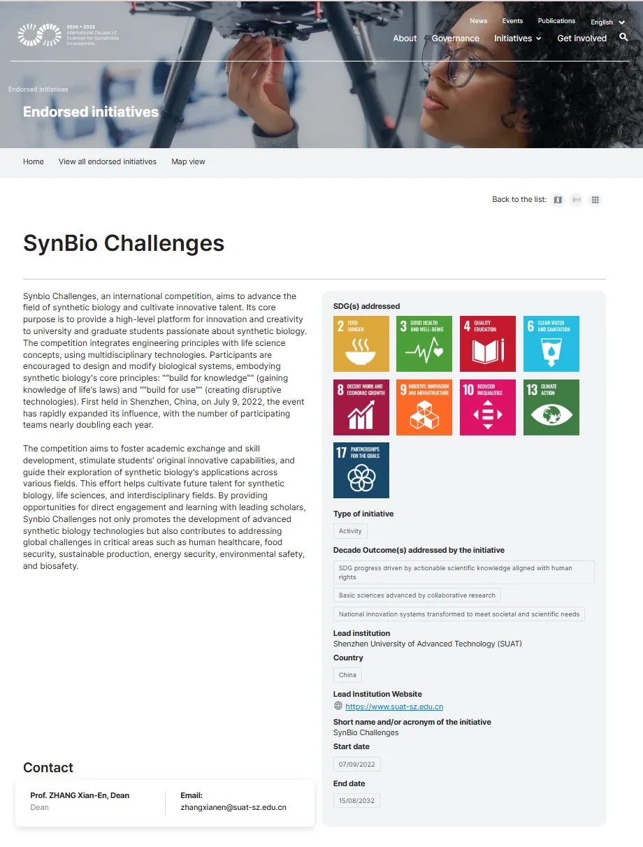 近日,由中国生物工程学会主办、深圳理工大学与中国科学院深圳先进技术研究院等单位联合发起的合成生物学创新赛(以下简称“创新赛”),成功入选联合国教科文组织“科学促进可持续发展国际十年行动计划(2024–2033)”(以下简称“科学十年”)首批认证项目。