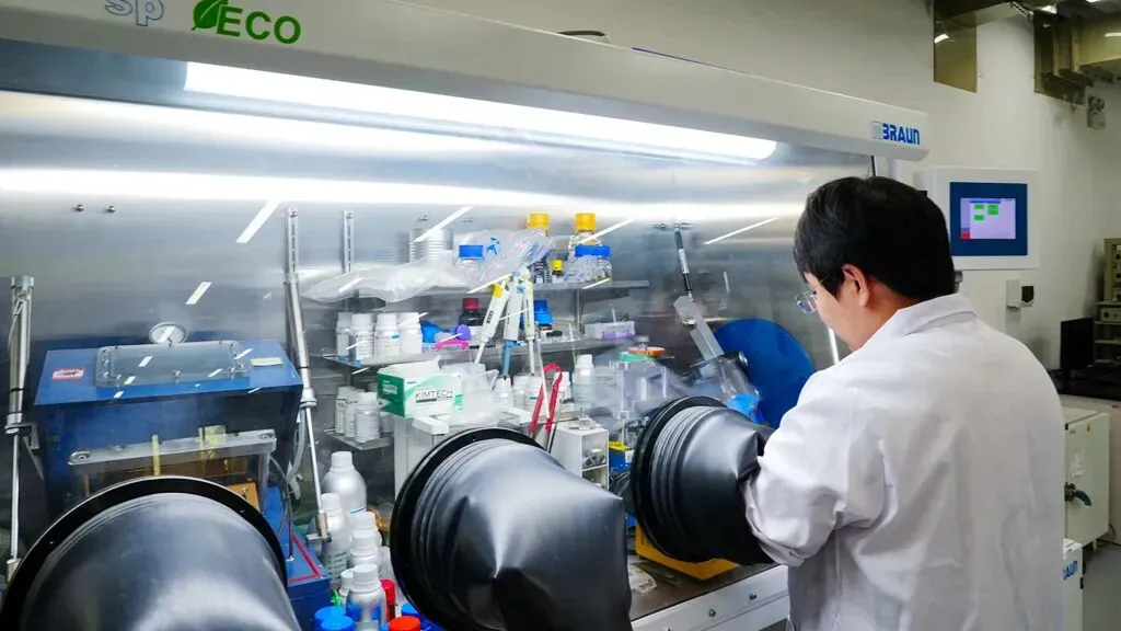 在惠州,东江实验室重离子微孔膜技术人员在手套箱中开展锂电能源材料实验。