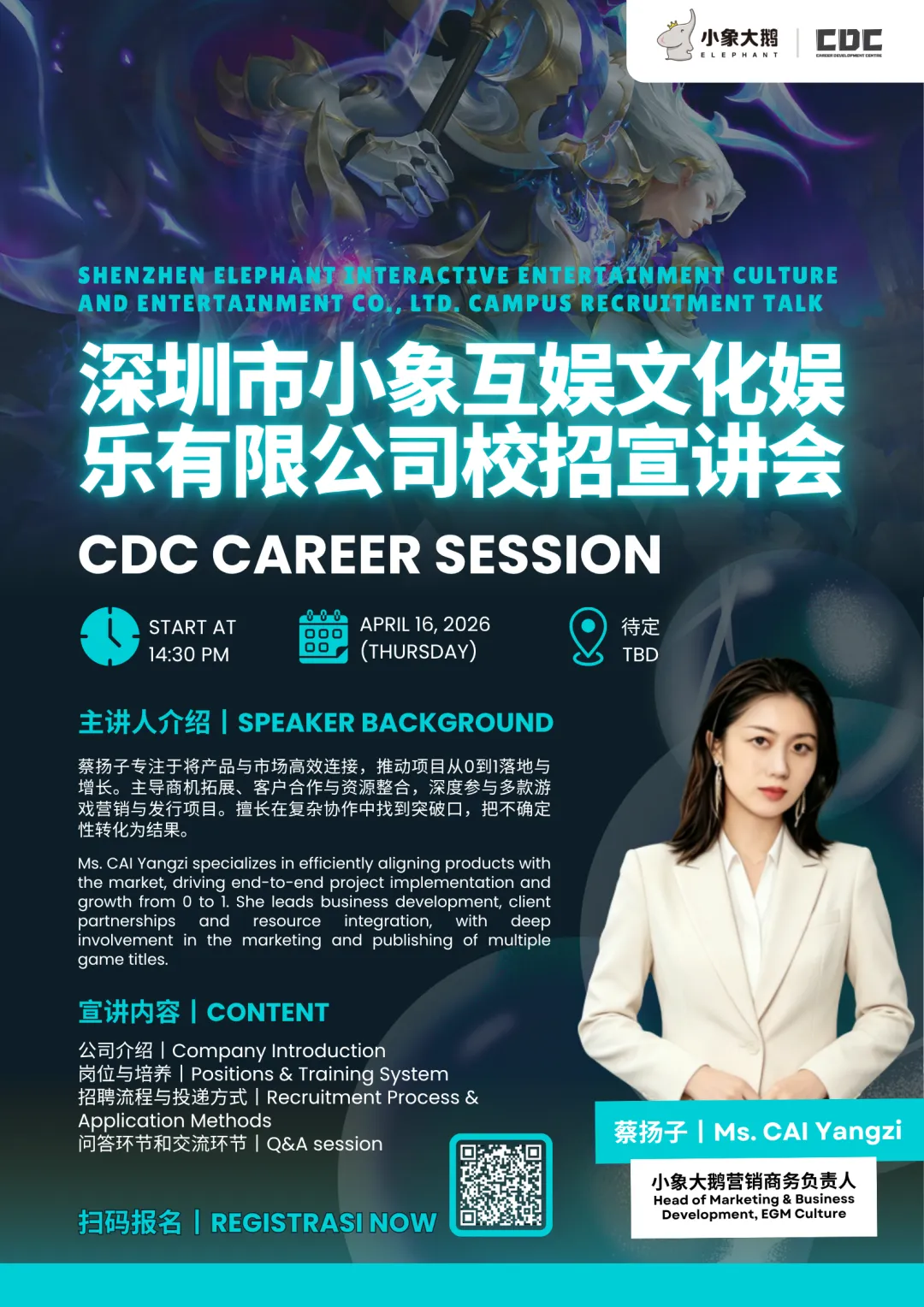 为帮助同学们深入了解电竞游戏、数字内容营销及直播经纪行业的发展趋势及职业机会,学生职业发展中心(CDC)诚邀深圳市小象互娱文化娱乐有限公司(小象大鹅)来校举办专场宣讲会。欢迎对游戏、内容创作、营销策划、新媒体运营领域感兴趣的同学踊跃参加!