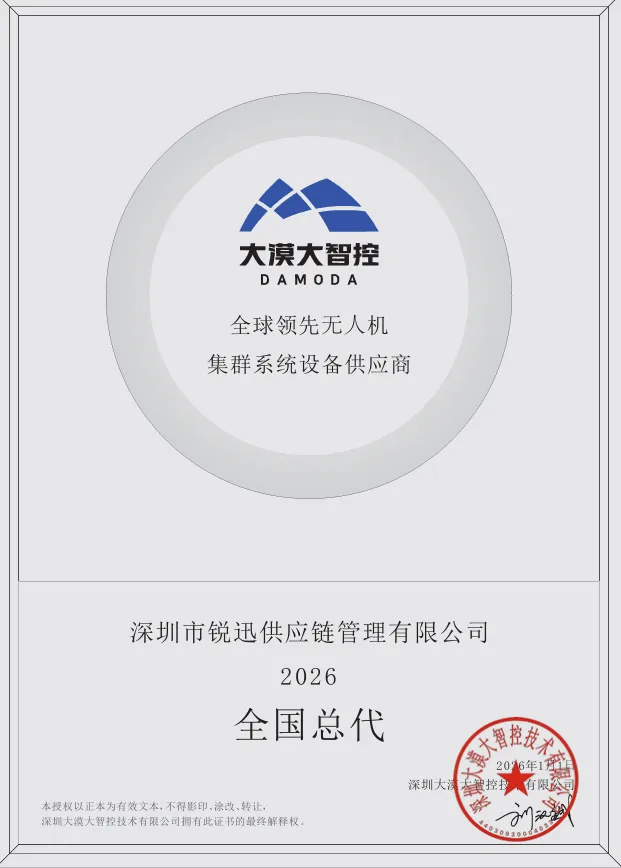 此次大漠大智控授予锐迅2026年度全国总代资质,是对其综合实力的认可。大漠大智控作为全球领先的无人机集群系统供应商,拥有核心技术与行业标杆案例。双方强强联合,锐迅将依托大漠大的技术优势,面向全国推广无人机集群系统及智能低空装备,助力低空经济规模化落地。