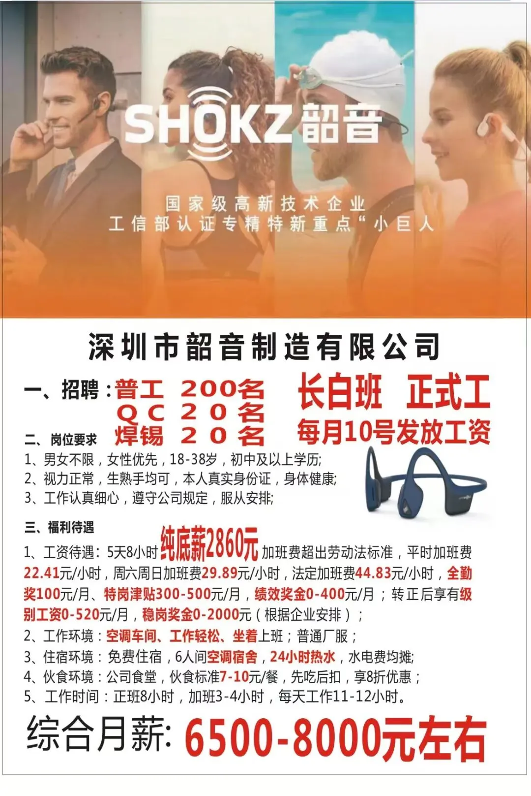 深圳石岩韶音科技招聘,女生超多·长白班坐班、做事轻松、好留人,月薪7000+,稳定靠谱!