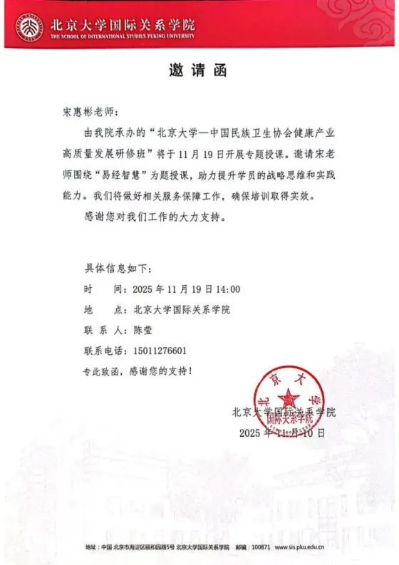 宋惠彬老师2025年11月19日北京大学-中国民族卫生协会健康产业高质量发展研修班的邀请函