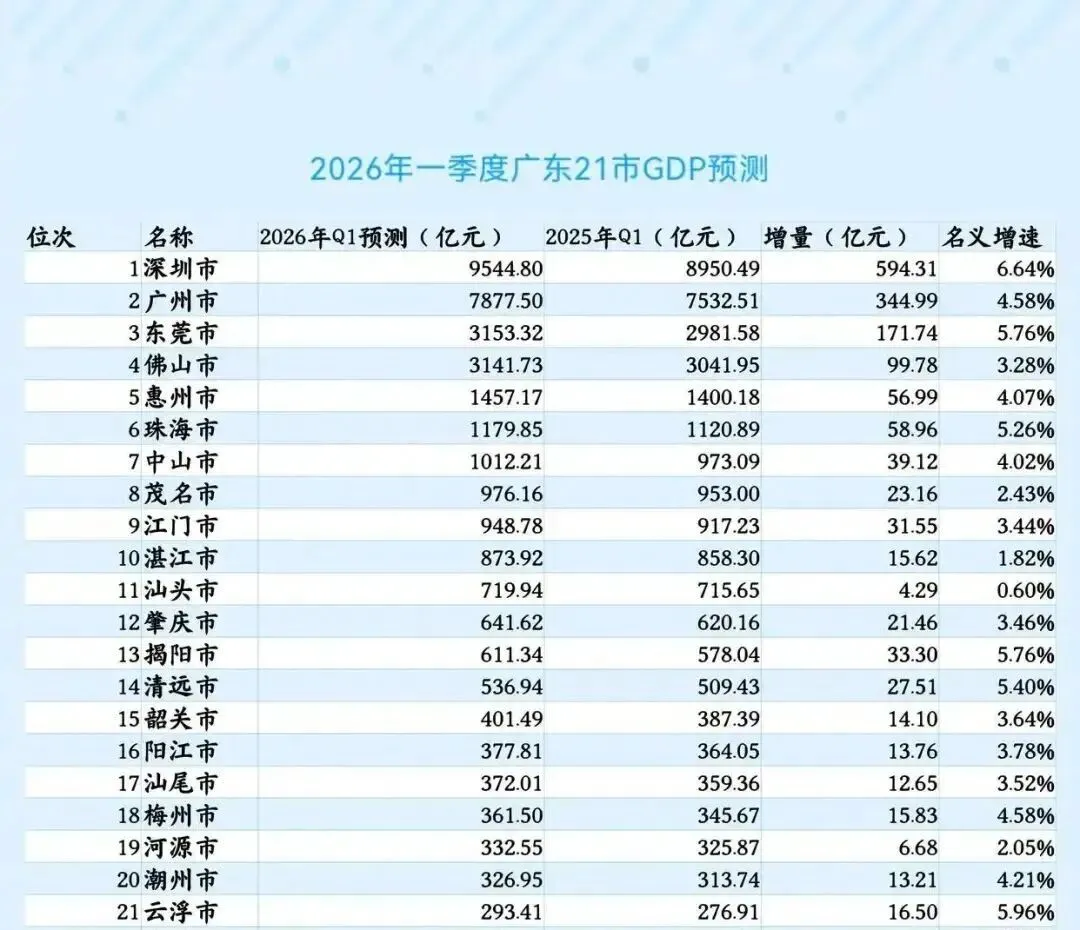 真正有意思的,是底下21个城市的座次表。有人狂飙,有人逆袭,有人原地踏步。最抓眼球的三个现象:深圳快摸到万亿门槛了,东莞历史性反超佛山,而湛江和汕头的增速,一个1.82%,一个0.60%,让人有点着急。