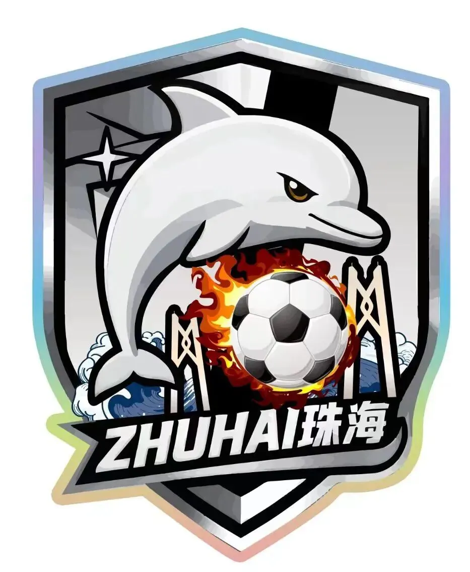 中华白海豚象征球队敏捷战术与协作精神,火焰红金足球迸发足球激情,暗合大湾区蓬勃动能;黑白足球与海浪交织,盾牌底部港珠澳大桥线条恢弘,象征球队扎根湾区、通联世界的开放格局。