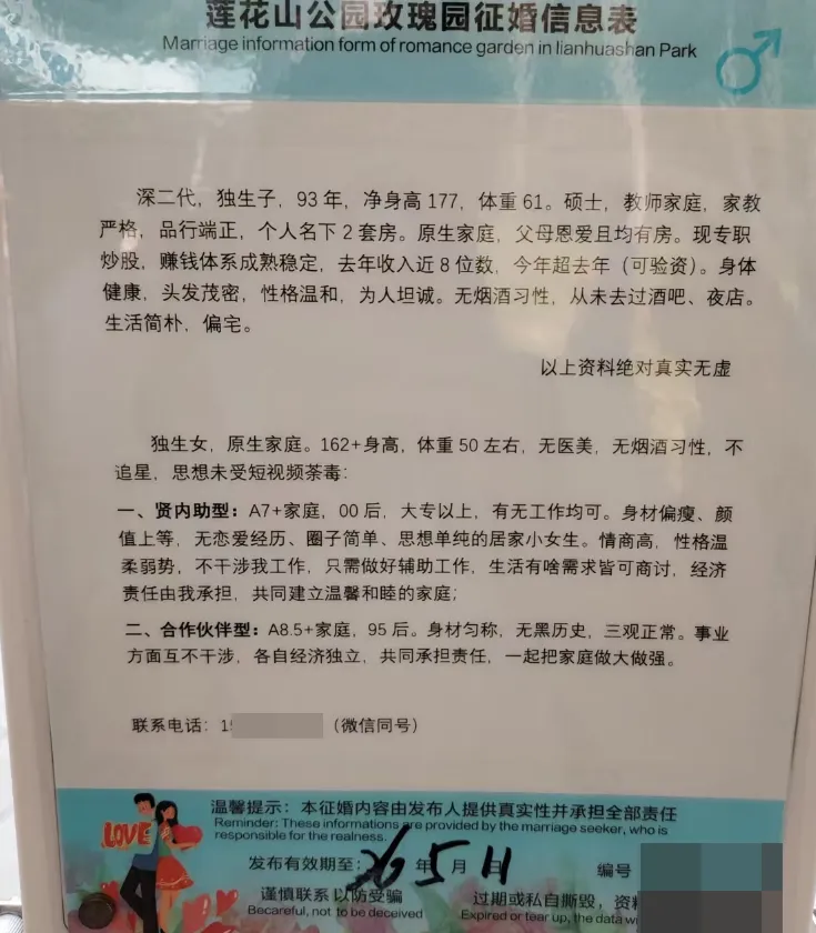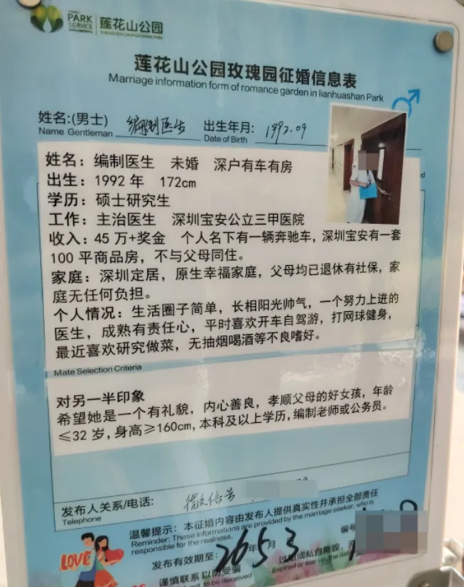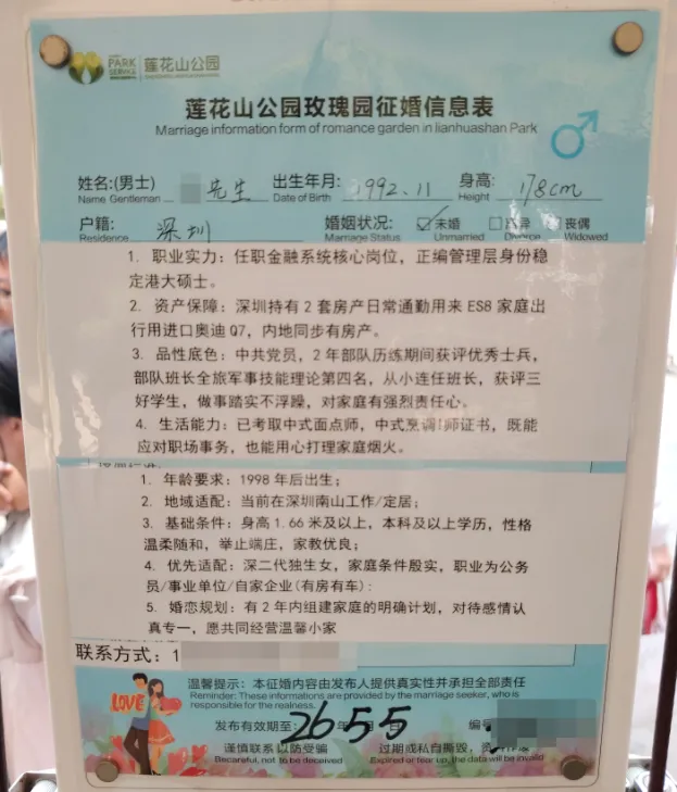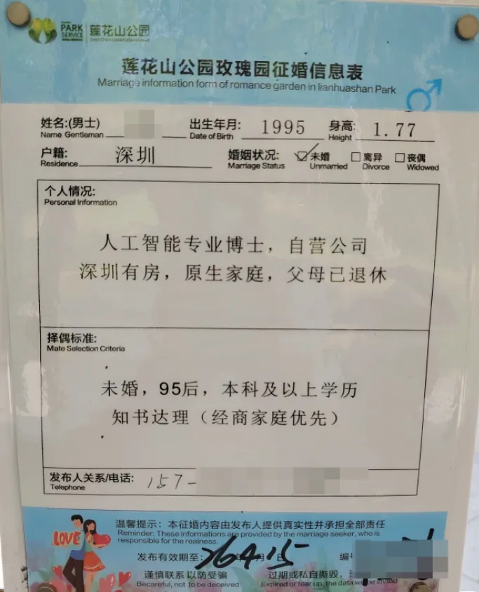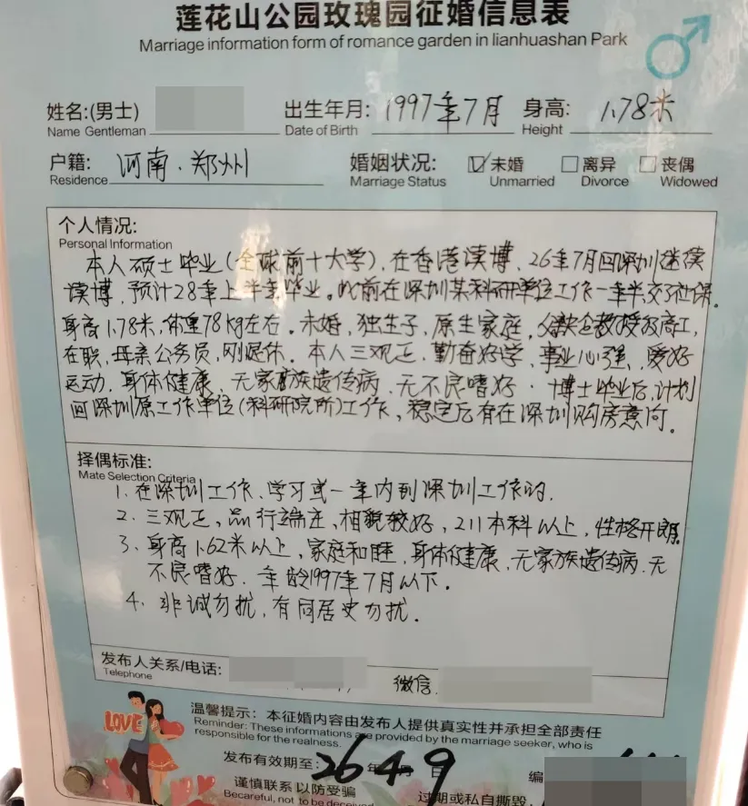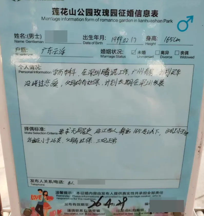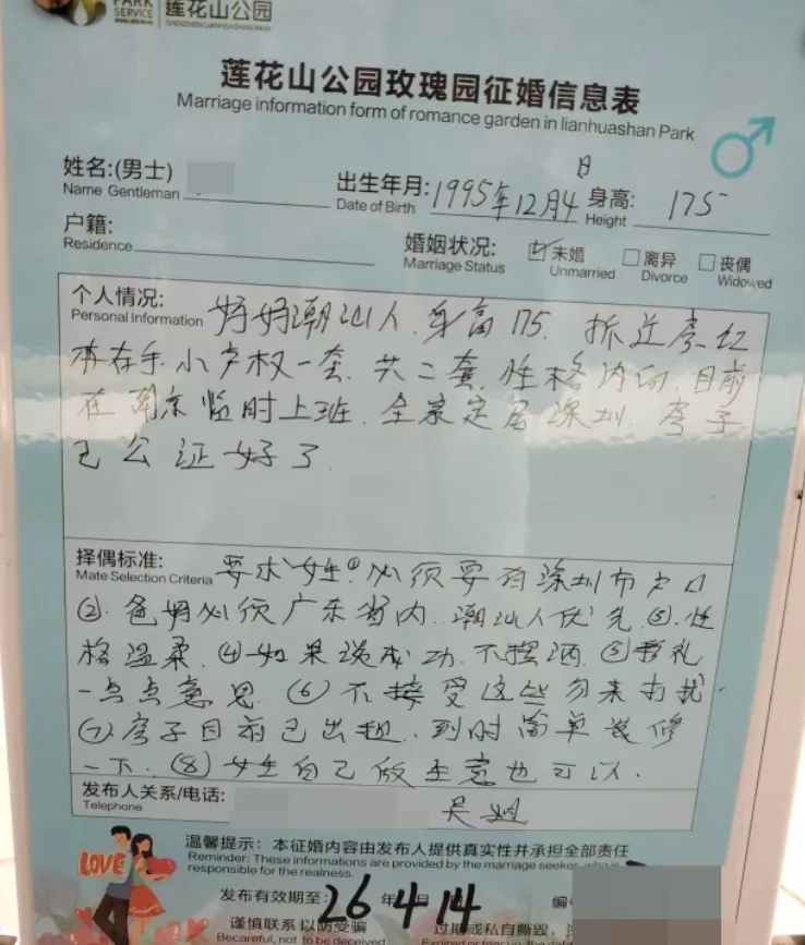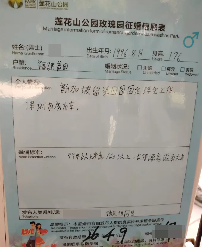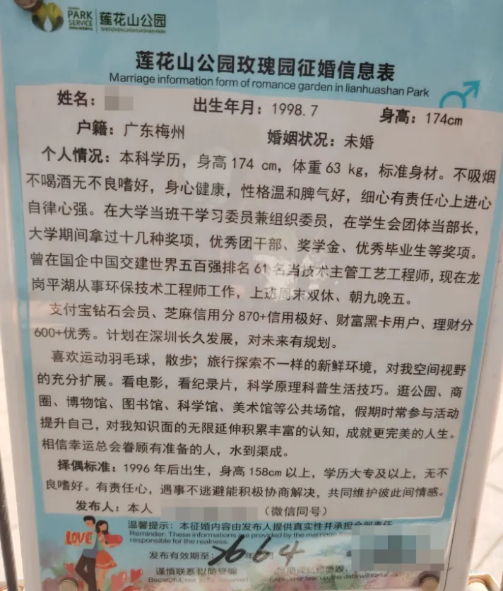 择偶标准:97年7月后,身高162以上,学历211本科以上,相貌较好,性格开朗,有同居史勿扰(此点无法核验),无家族遗传病,已在深圳工作或一年内到深圳工作