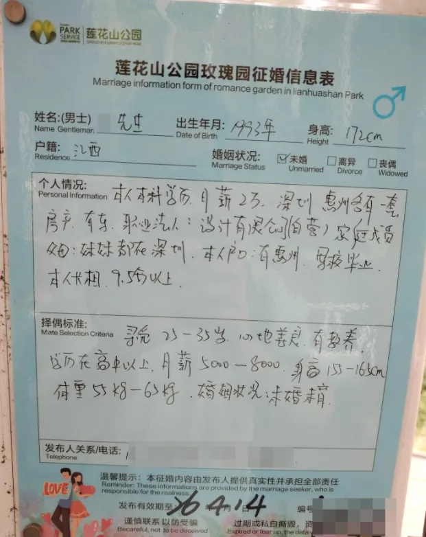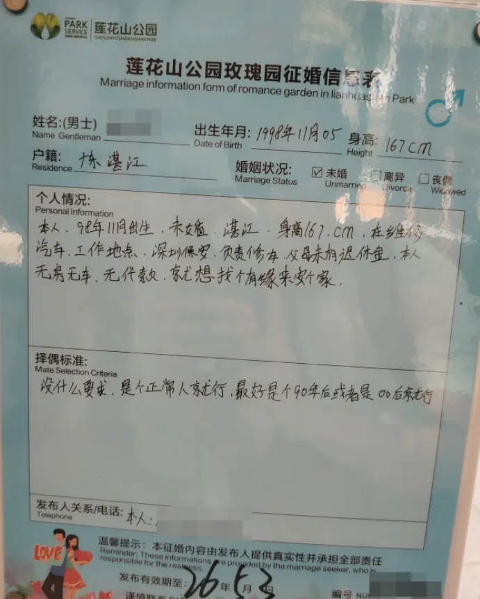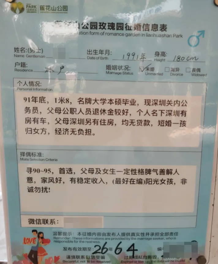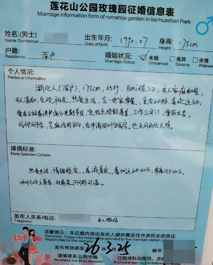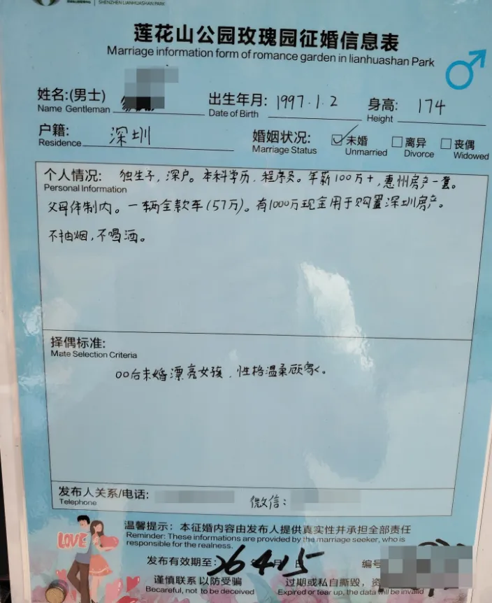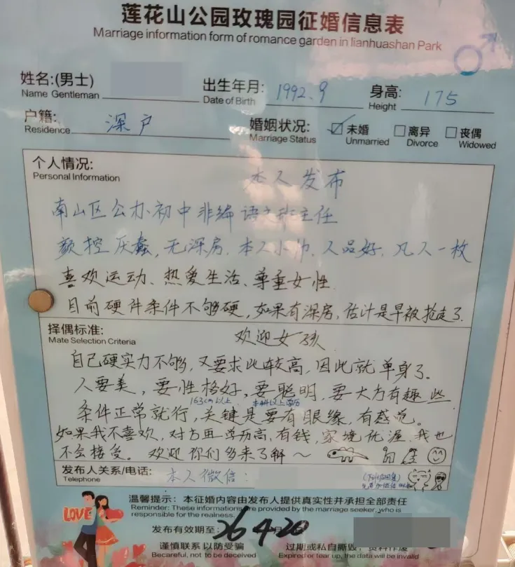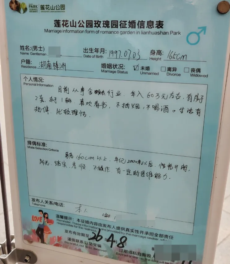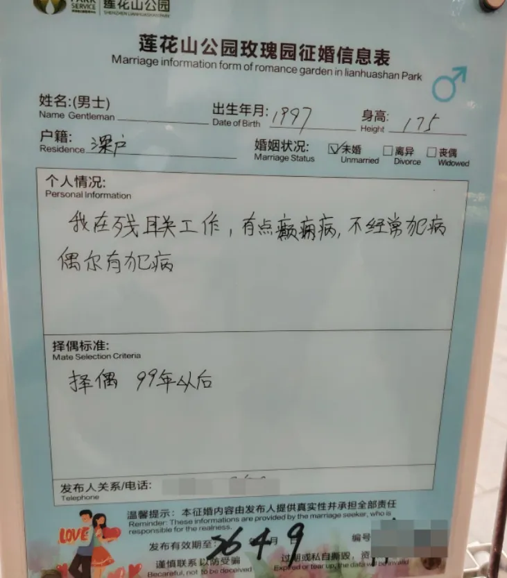 个人情况:92年,身高175,初中教师,外貌小帅,颜控,厌蠢(这描述总感觉怪怪的),爱运动,爱生活,尊重女性,因为深圳没房,否则早被抢走了(瞎说大实话) 择偶标准:人美,性格好,聪明,有趣,关键需有眼缘,否则女方学历再高,家庭再有钱也不接受(一位纯爱战士)个人情况:97年,身高175,在残联工作,有点癫痫病,偶尔犯病(如此地坦诚?也没提及其他优势)4)