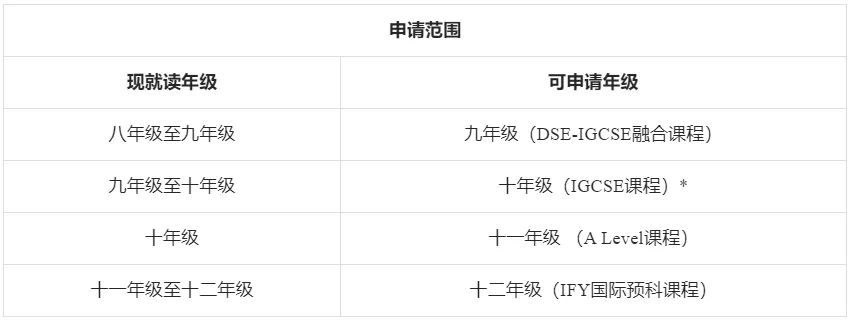 *申请十年级:在读IG学生需现在学校学习9年级IGCSE至少六门科目,包括中英数及三个选修课;中考学生需在模考/中考获得565分以上的成绩。
