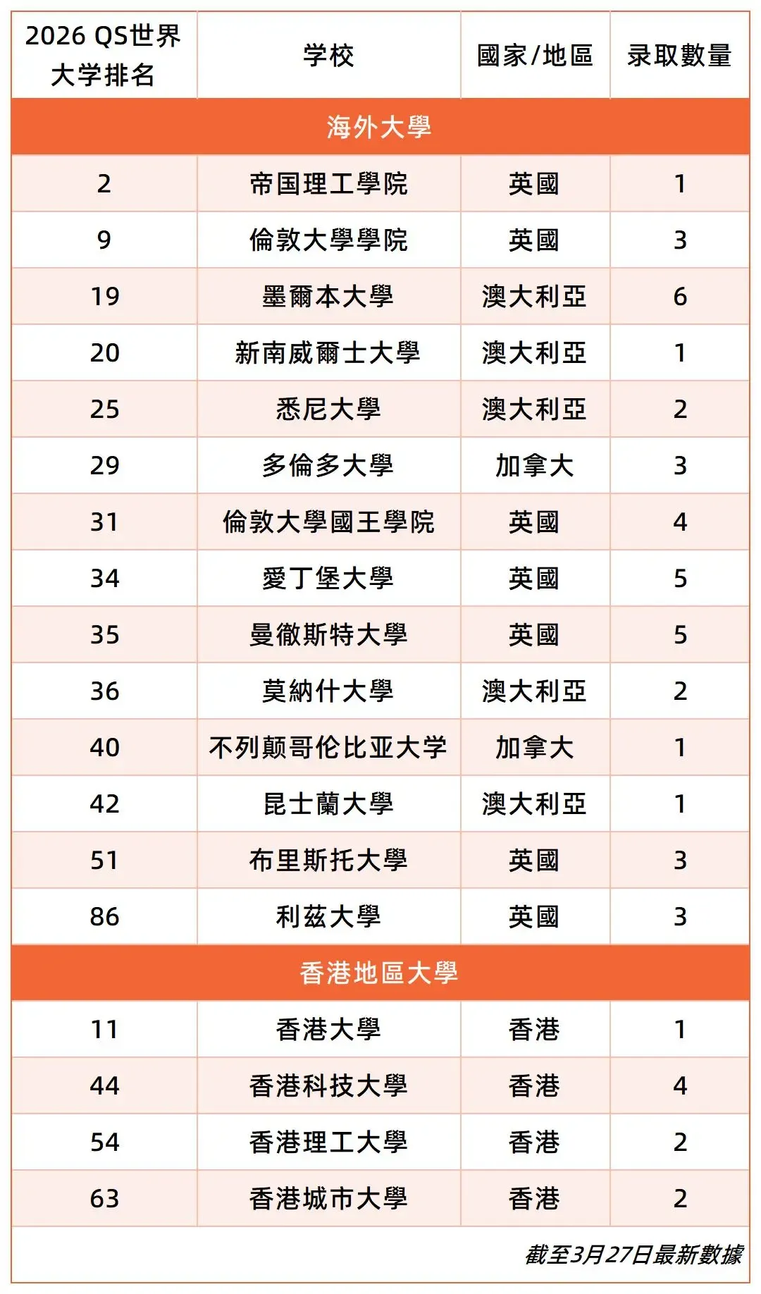 截至2026年3月27日,2026年国际课程十二年级共十名学生人均收获5份包括帝国理工、港大、港科大在内的全球前100大学的预录取通知,专业包含工程、数学、经济商业、科学及交叉领域等。 部分录取院校如下: