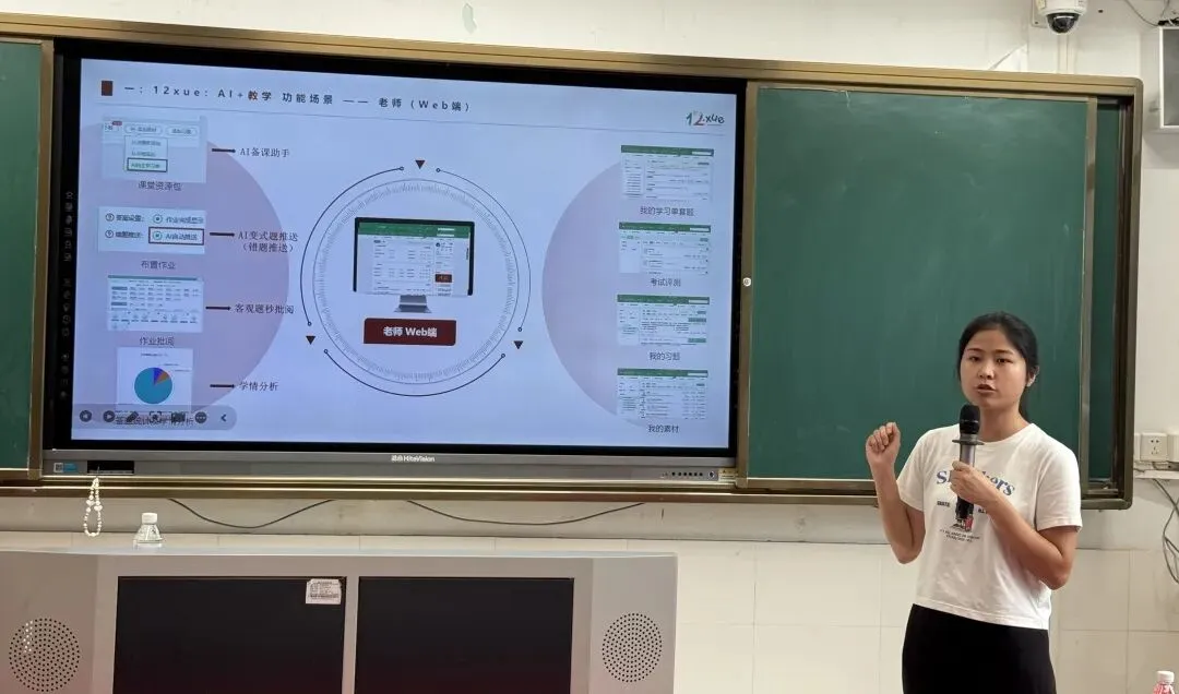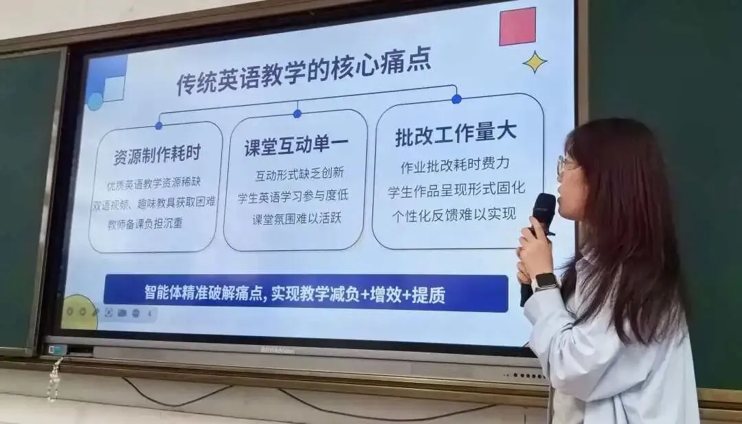 英语科组黄文文老师则聚焦课堂教学创新,生动演示了 AI 技术在情境创设、资源生成、多维评改中的应用。通过 AI 工具高效制作趣味教具、打造沉浸式微课、实现作文智能批改,极大丰富了课堂内涵,有效提升了学生的学习兴趣与语言运用能力。
