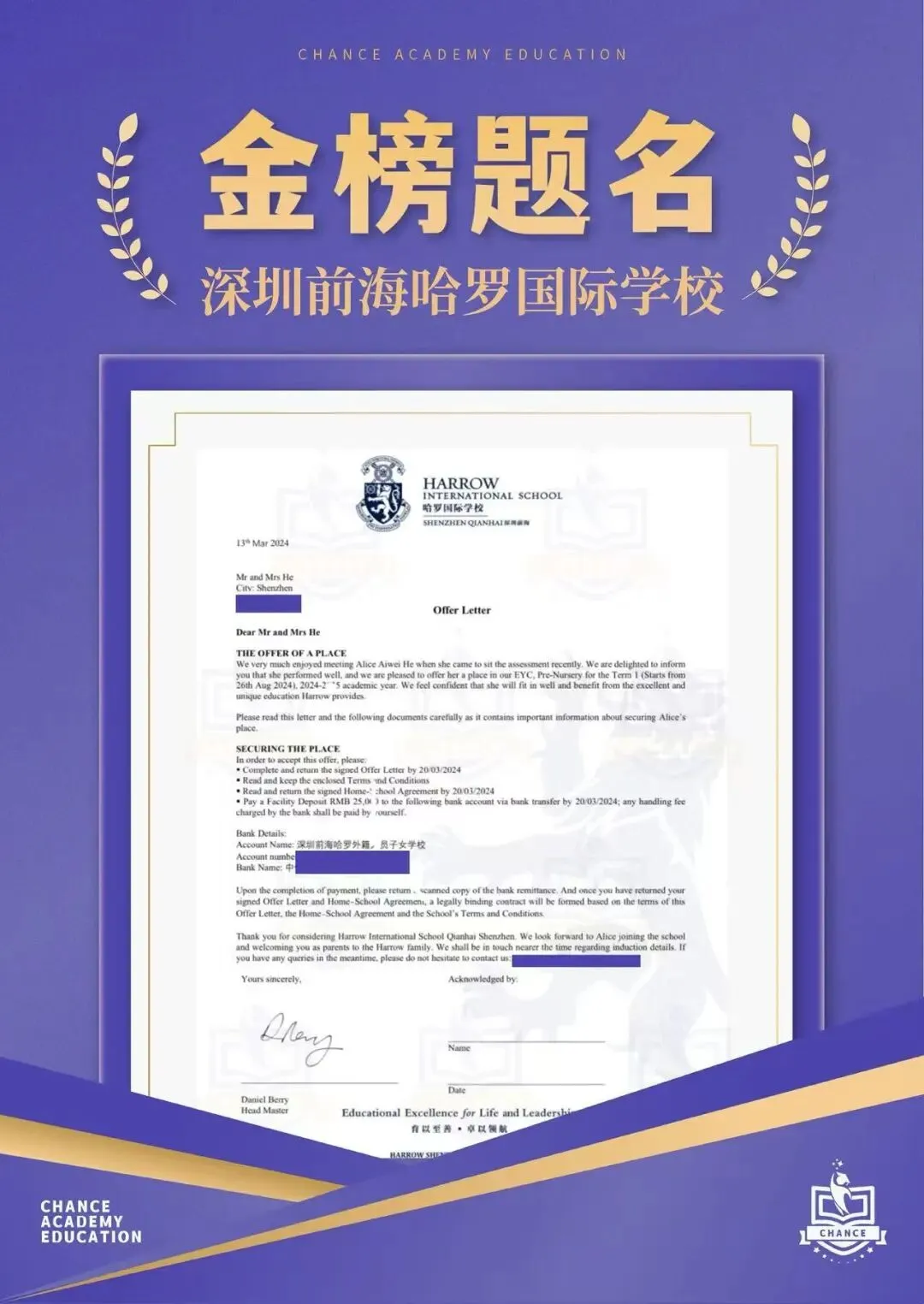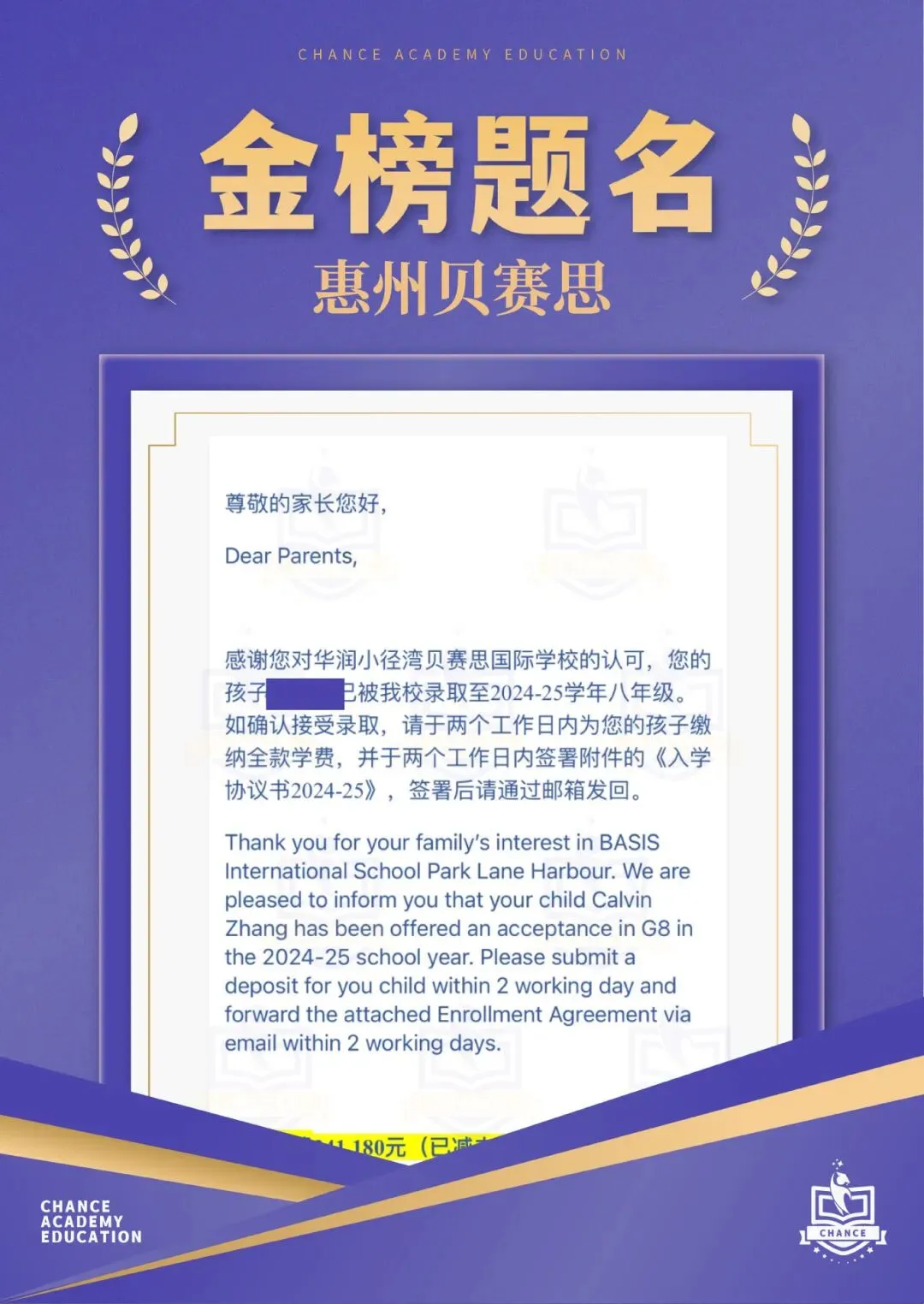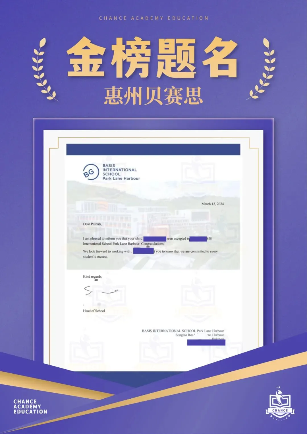升学成果:近年有学生被藤校录取,共收获630封来自美、英、加、澳、港等国家及地区的顶尖名校录取,奖学金总额约人民币1950万元。