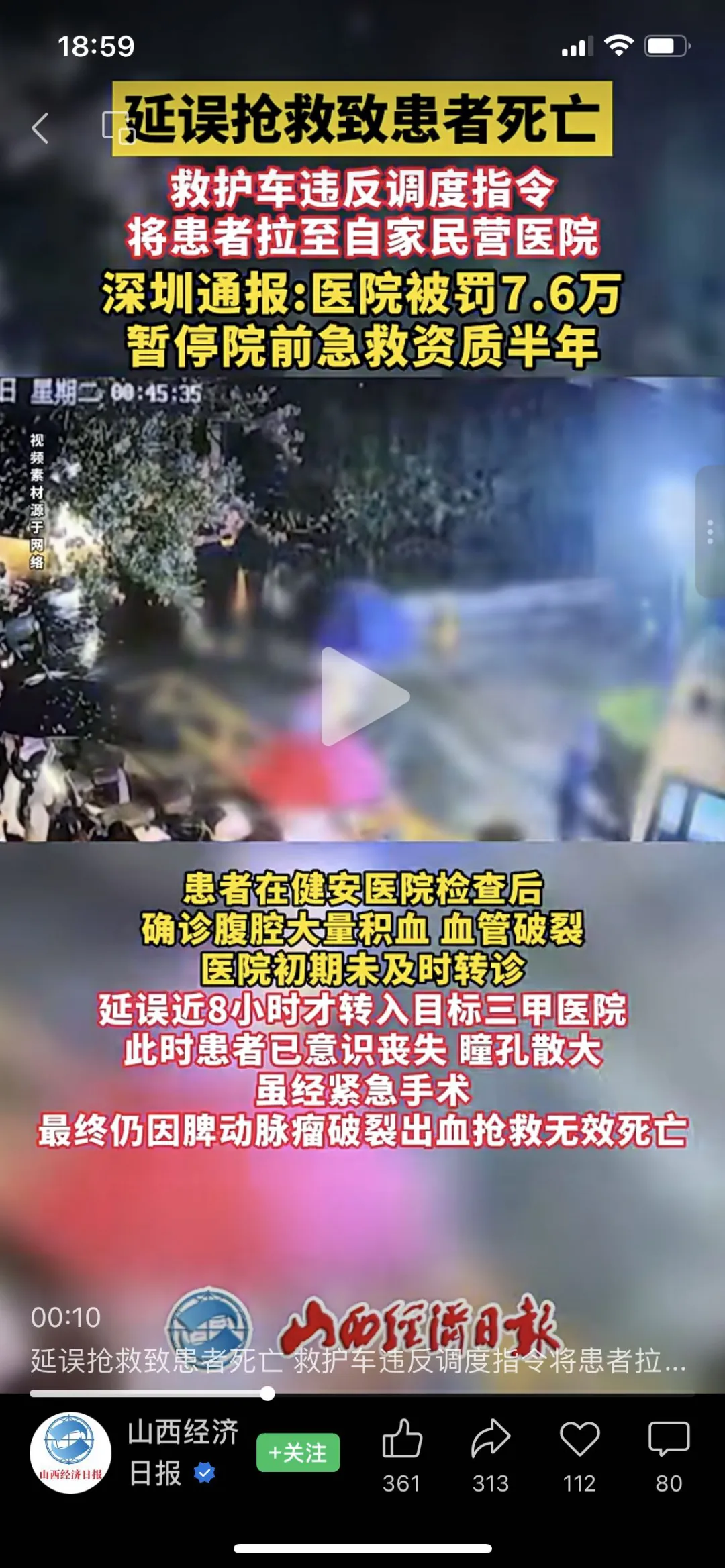 这几天,深圳120事件沸沸扬扬,深圳120救护车把患者拉到很远的私立医院,不拉到就近的公立三甲医院,耽误近8小时,才转入龙华人民医院,最终因脾动脉瘤破裂出血抢救无效死亡。