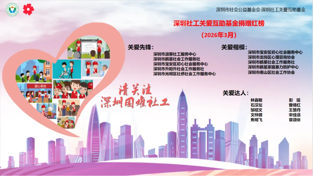截至2026年3月,基金本年度共收到700余名社工捐赠约2.5万元,12家机构参与配捐约2.9万元,社工捐赠及机构配捐总计约5.4万元。根据《深圳社工关爱互助基金效益提升方案》,基金管委会办公室评选了2026年3月份关爱先锋(累积捐赠总金额最多的前5家机构)、关爱楷模(人均配捐金额最多的前5家机构)和关爱达人(以个人名义直接捐赠或募捐的总金额最多的前10名人员),并设立捐赠红榜。现将月度红榜公布如下: