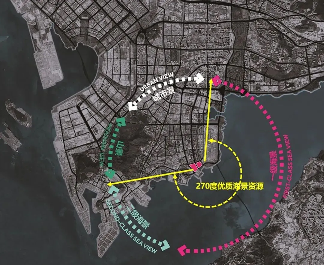 项目坐落于南山后海大道与望海路交界的东北角,地处东角头片区的“端头”位置,三面环海,西望深圳湾口岸与香港,南临建设中的深圳歌剧院,北接翡翠海岸等成熟豪宅区。