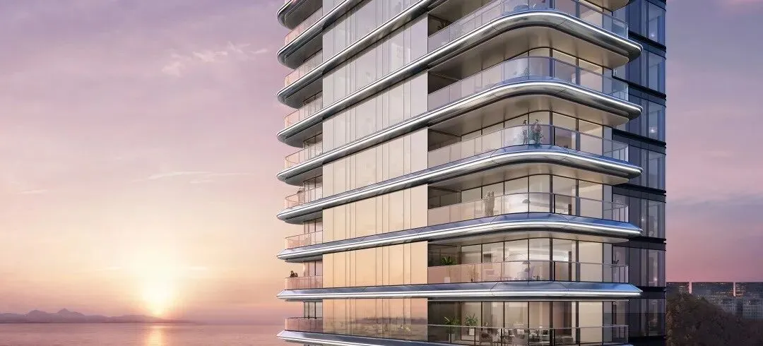 采用曲面玻璃幕墙与金属材质,建筑如粼粼波光,将海景与天空动态收纳。