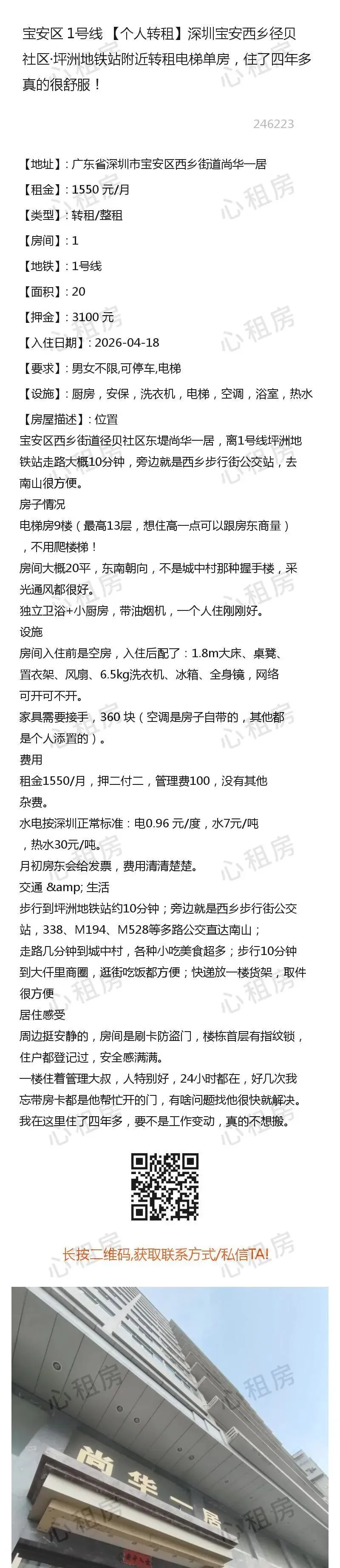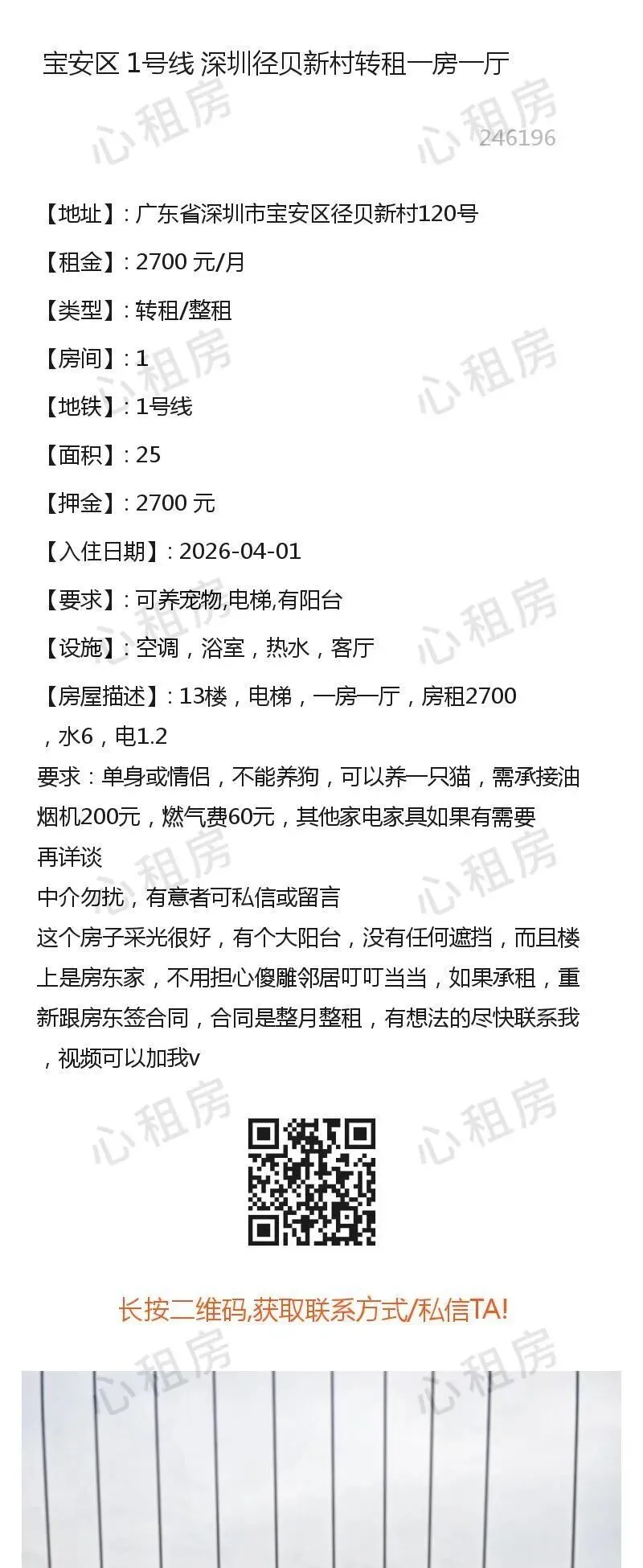 深圳租房【宝安3则】房源①:1号线深圳宝安西乡径贝社区·坪洲地铁站附近转租电梯单房1550元/月;房源②:.........