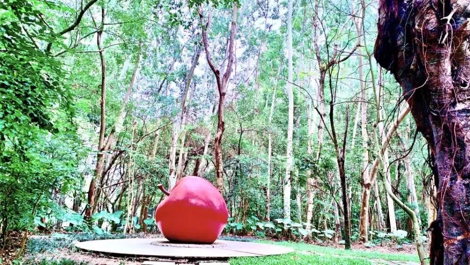 路两旁尽是树木灌木,绿得层层叠叠。慢悠悠晃了没多远,一颗巨型红苹果雕塑蹲在那儿。在灰白树干与翠绿藤蔓的环绕中,这颗苹果像是从童话里滚落的道具。