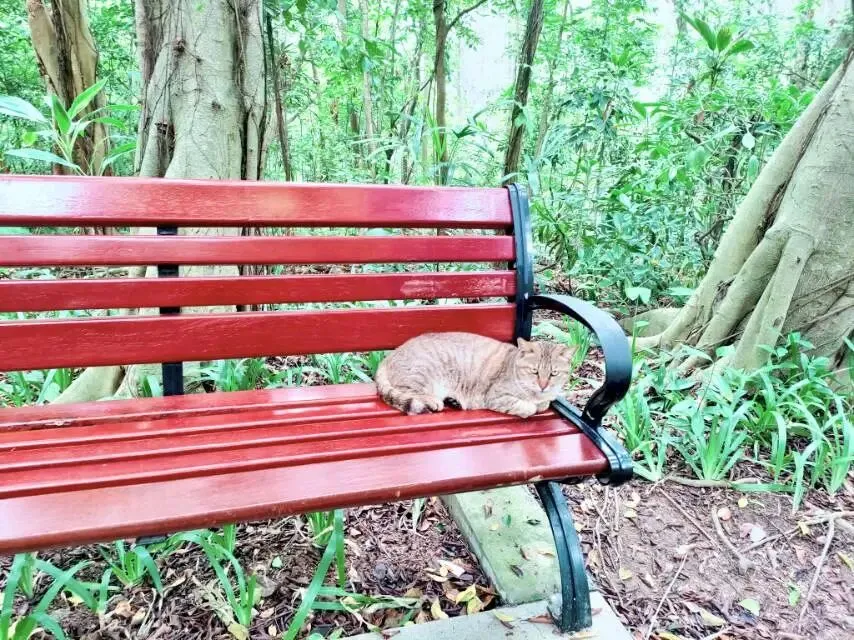 走累了,拐进一条林荫小道,一只虎斑猫正蜷缩在红色长椅上打盹。它眯着眼睛,对游客的镜头毫不在意——这是园博园的原住民,见过太多世面,也像在说:你们忙你们的,我歇我的。