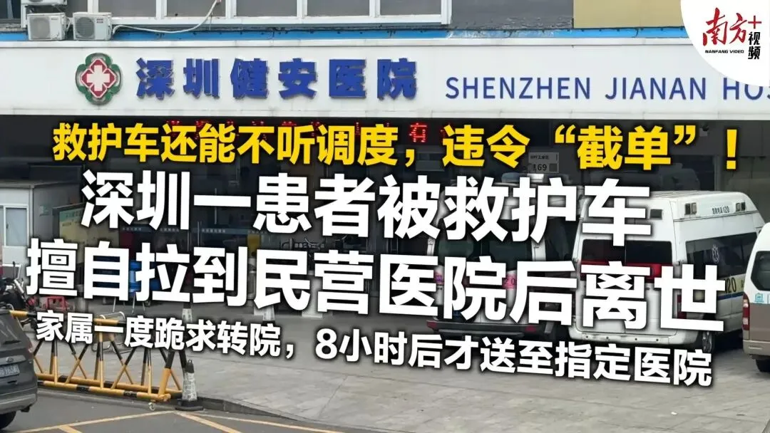 然而,2025年8月5日,深圳一家民营医院的急救车辆竟“截胡”病人,导致患者延误抢救时机不幸离世,令人扼腕叹息。